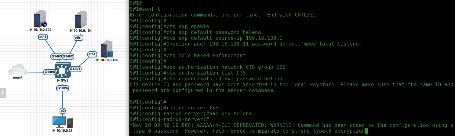 Before configuring TrustSec, make sure the NAD alrady has radius configuration for dot1x/mab authentication, after then we can put these config on top of it.