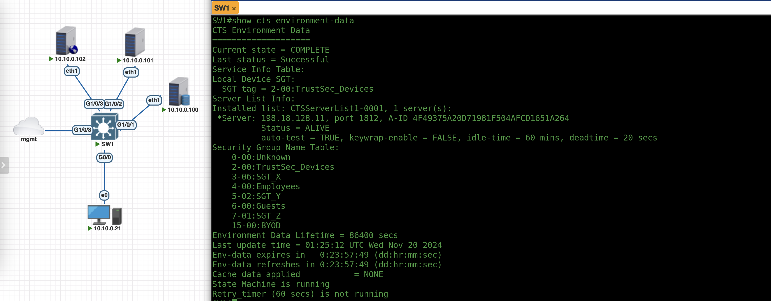 Command “show cts environment-data” shows the NAD has successfully downloaded the environment-data which contains the SGTs
