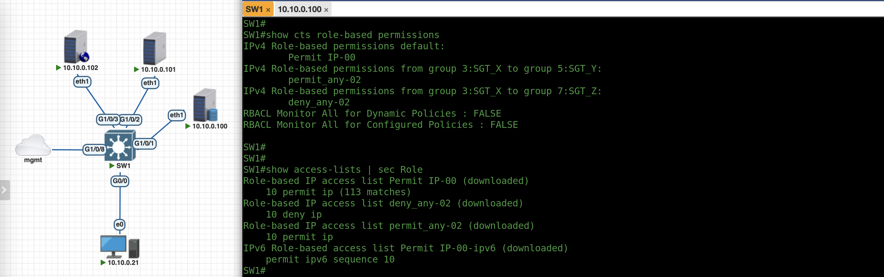 Running “show cts role-based permission” shows SGT Matrix rules, these rules are also automatically applied as access-lists