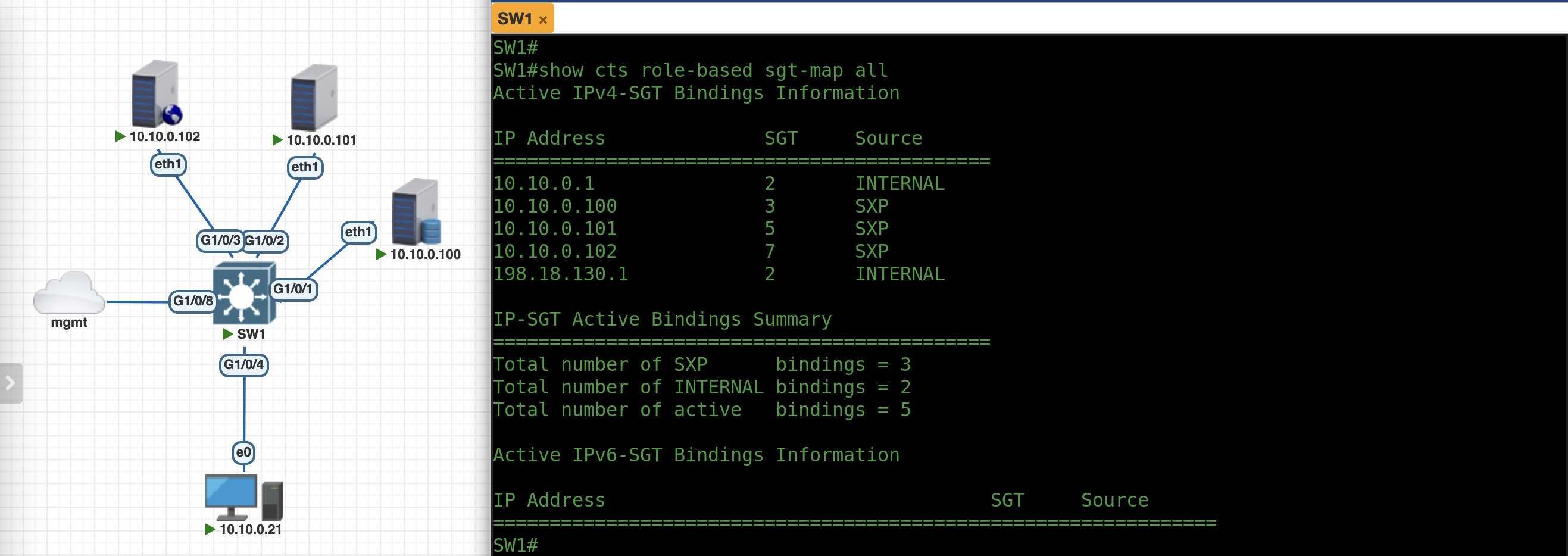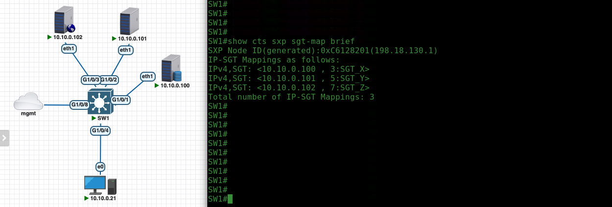 The command “show cts role-based sgt-map all” shows the IP-to-SGT mappings which are obtained from internal sessions or from SXP