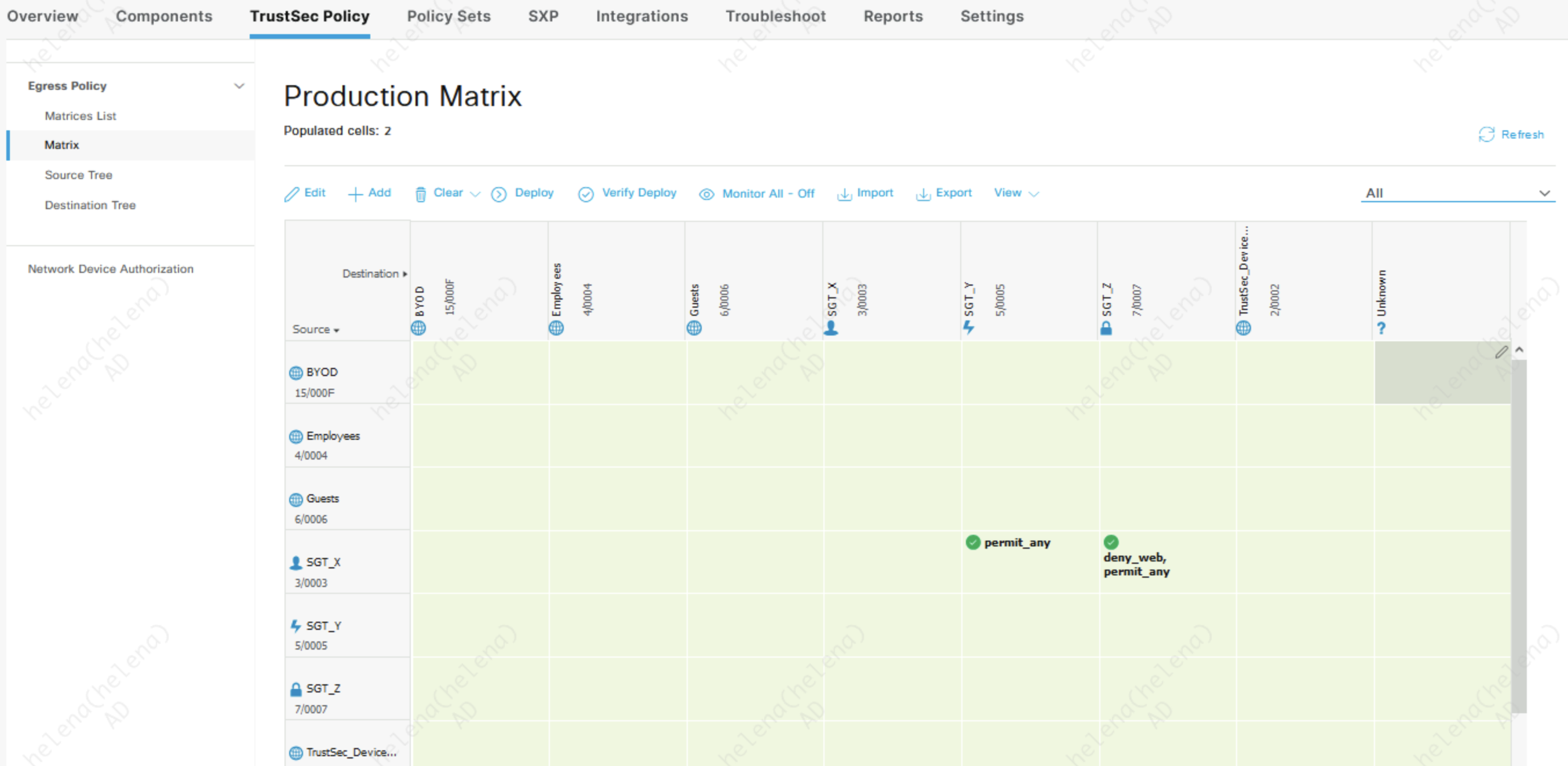 After that define the SGT access policy by creating the SGT Matrix, here we enable access from SGT_X to SGT_Y, but deny it to SGT_Z