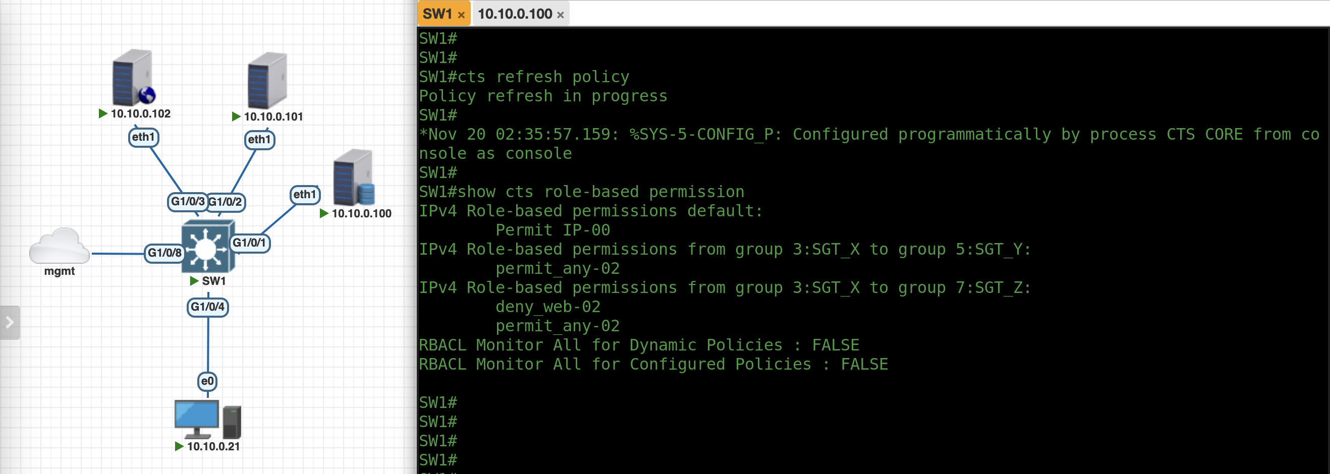 Here we have devices all in the same subnet, where .100 with SGT_X can access .101 with SGT_Y just fine, but not to .102 with SGT_Z