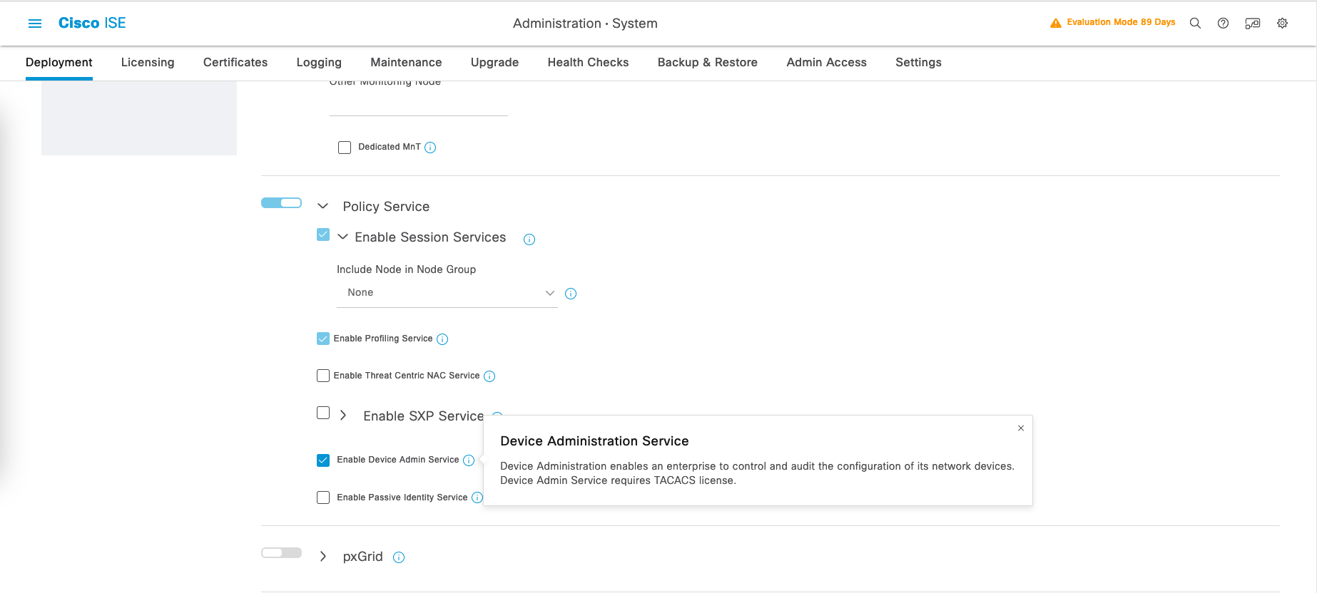 To allow the use of TACACS, firstly we have to enable Device Admin Service on Administration » System » Deployment