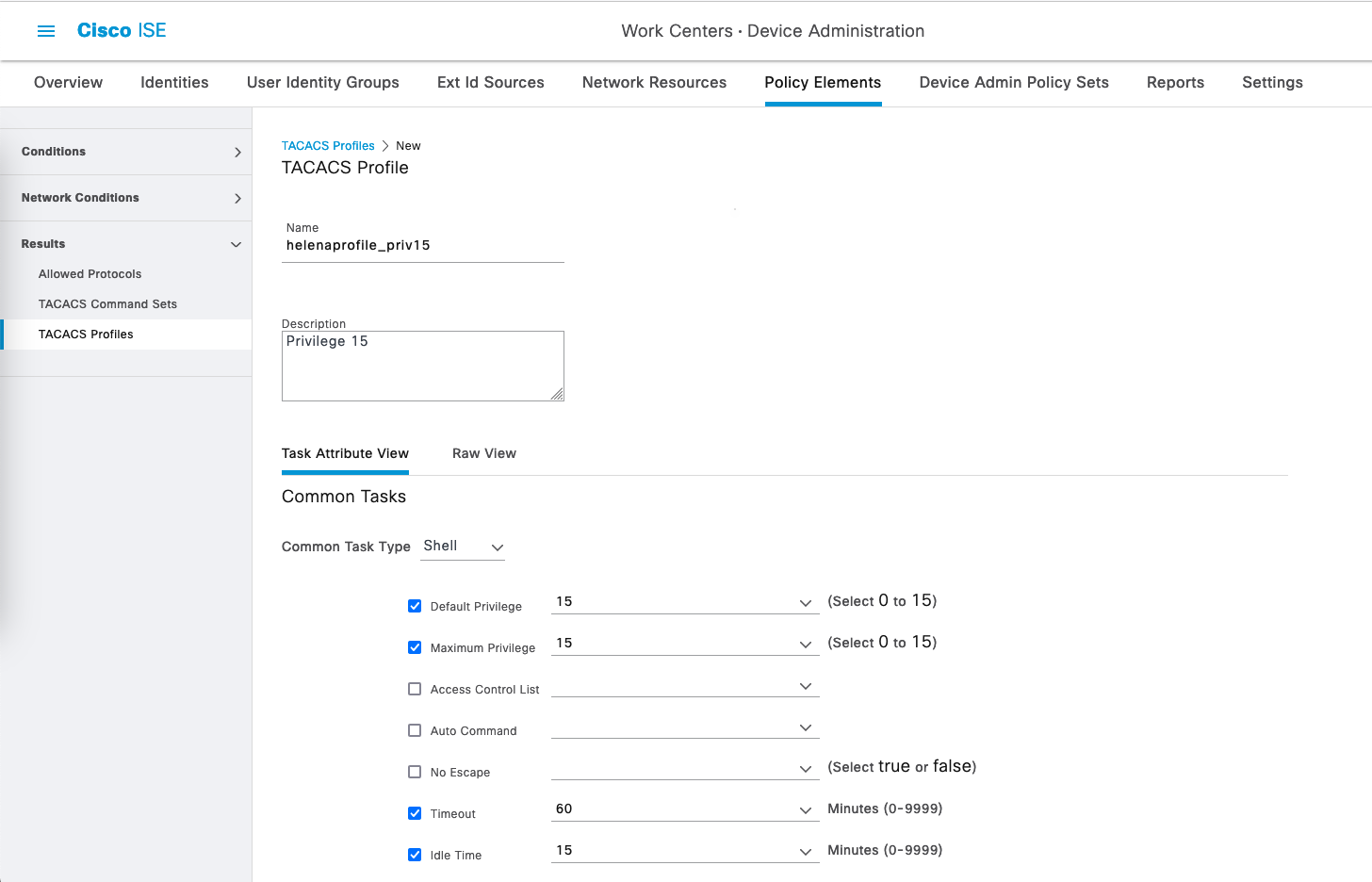 On Work Centers » Policy Elements » Results » TACACS Profile, create a new profile to allow access with privilege level 15