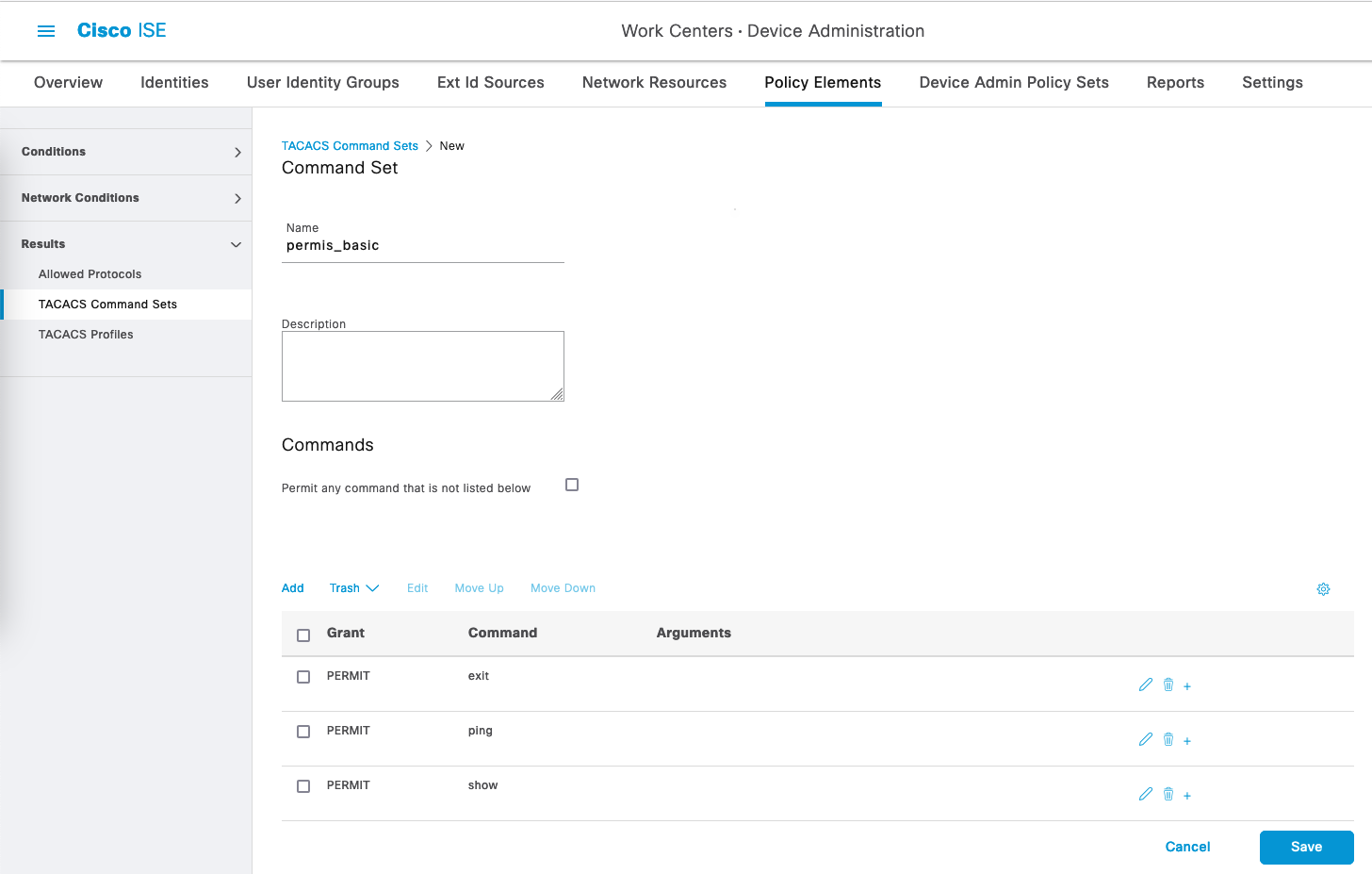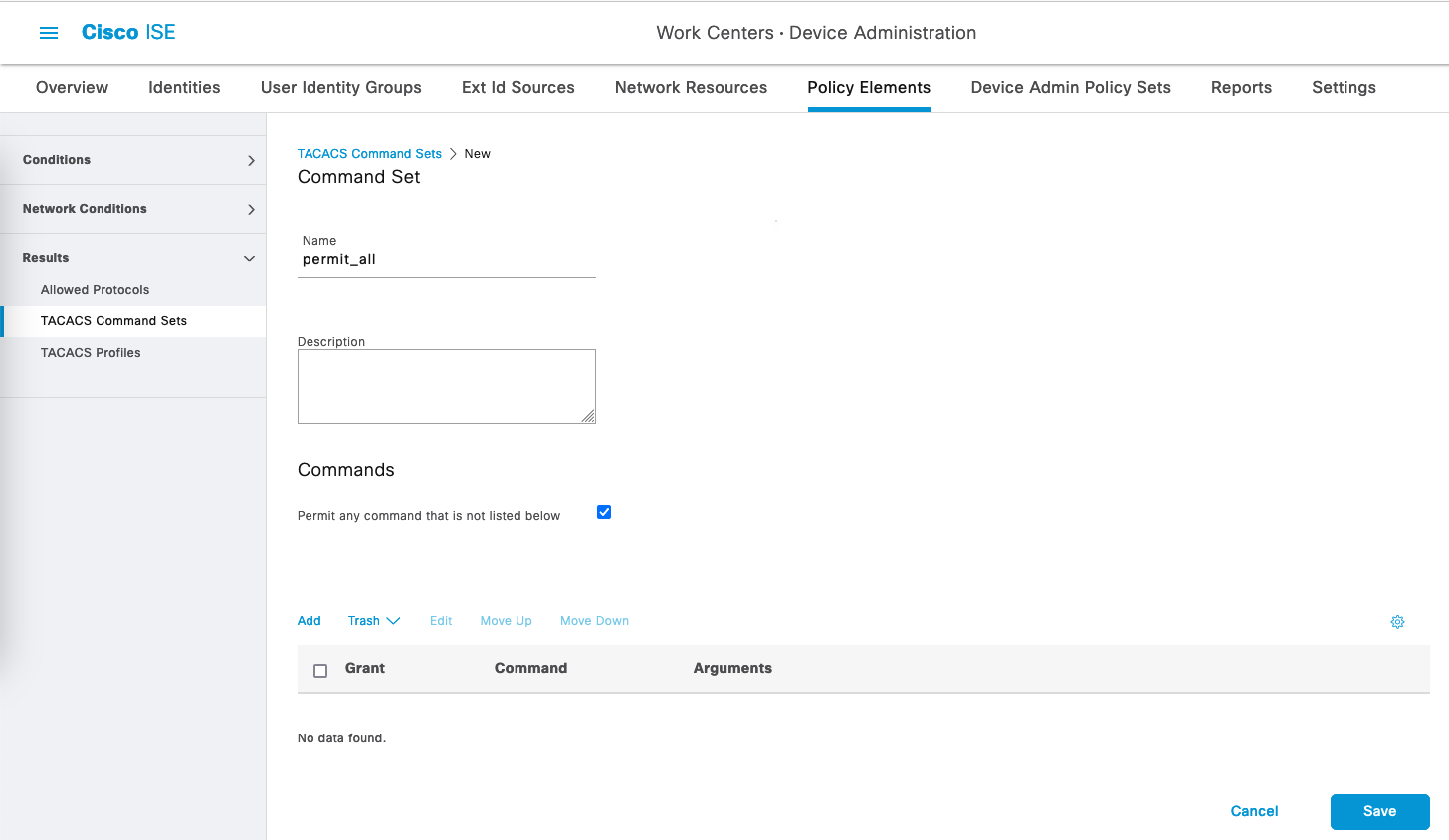 Then on TACACS Command Sets, create new one named “permit_all” to allow all commands