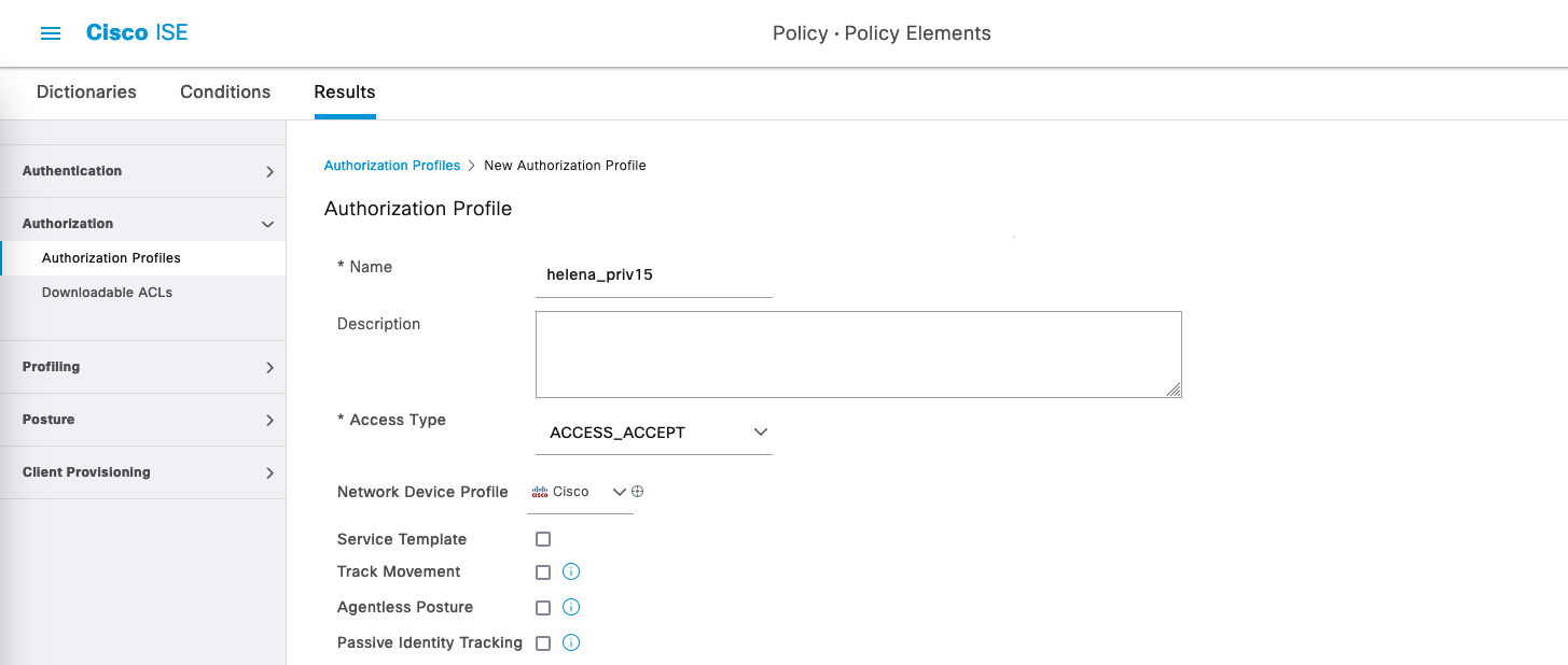 On Policy » Policy Elements » Results » Authorization » Authorization Profiles, create a new profile for level 15 privilege access