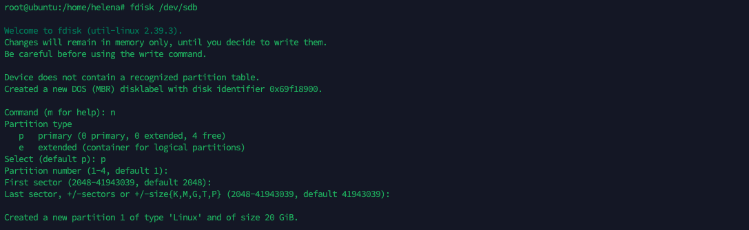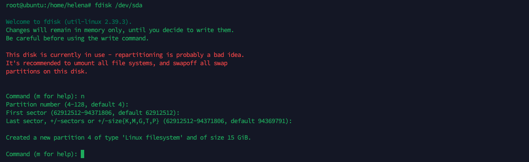 Firstly we need to create a new partition out of this disk, run the fdisk utility to do that