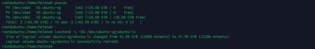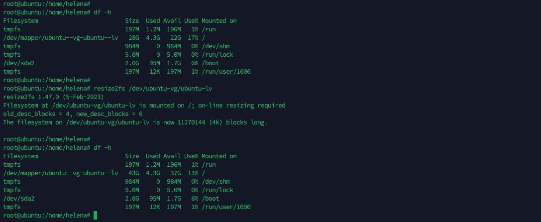 Lastly, we need to adjust the filesystem size to match the size of the underlying block device, to do that run “resize2fs /dev/ubuntu-vg/ubuntu-lv”