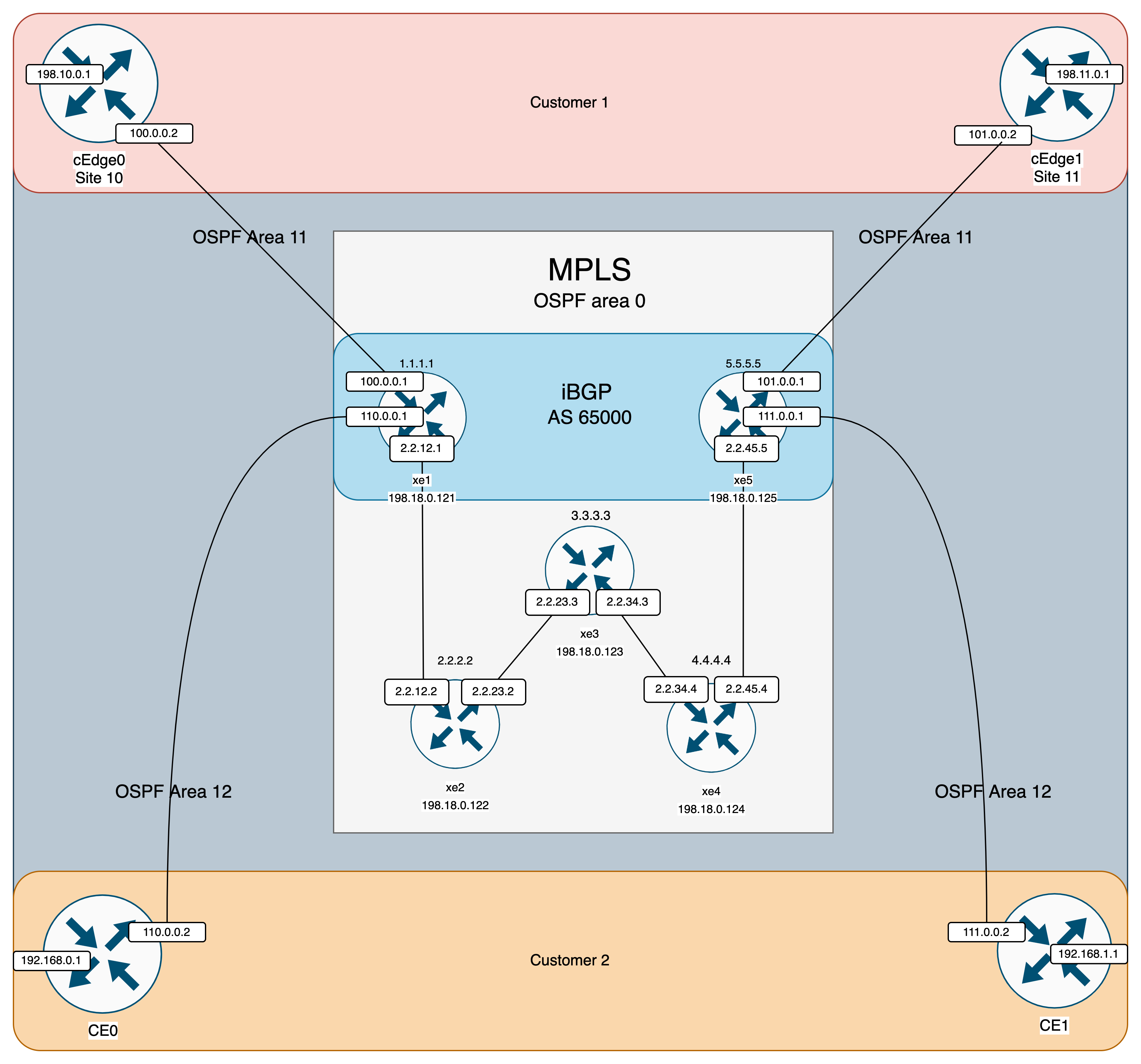 We have 5 Routers running MPLS where router xe1 and xe5 will become the PE (Provider Edge), meaning it’ll be the connecting router to the Customer’s router (CE or Customer Edge), which will be the cEdge0 & cEdge1 for Customer 1 and CE0 & CE1 for Customer 2.