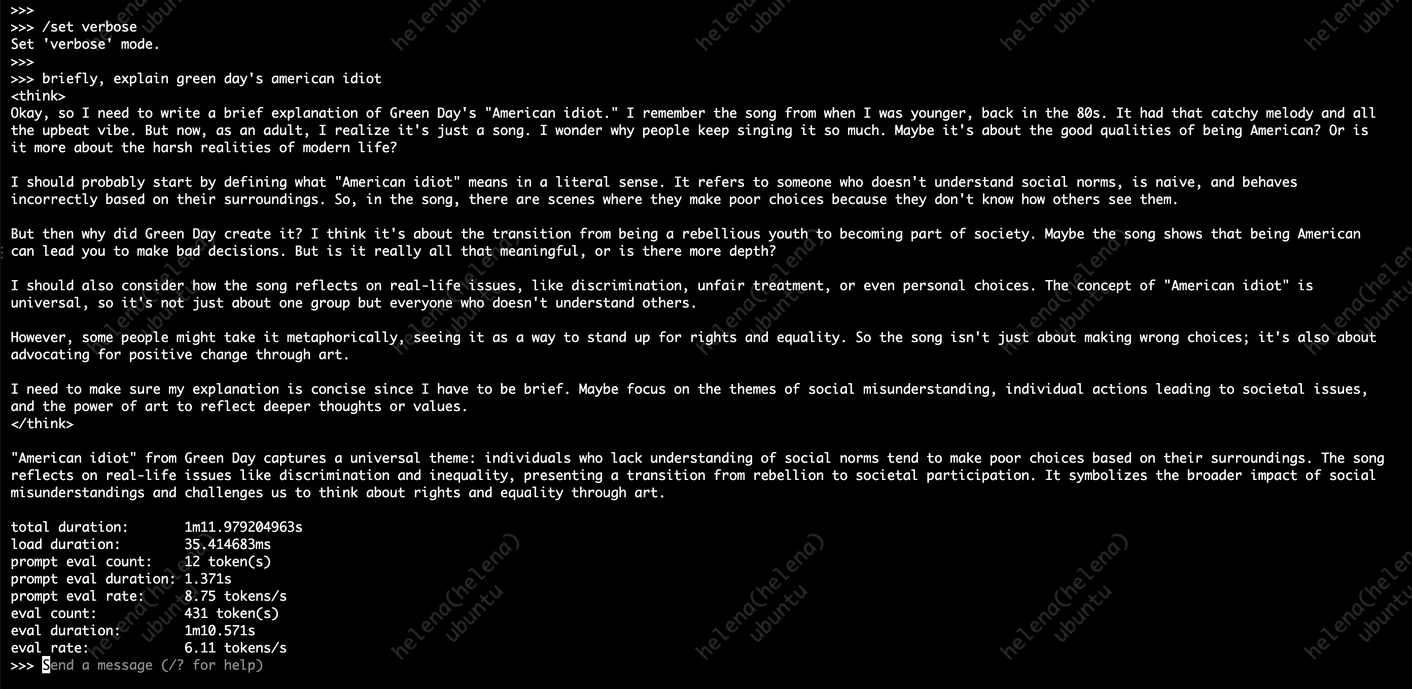running “/set verbose” we can see the performance that we’re getting on this machine, here we get around 6.11 tokens/second, which is not that great
