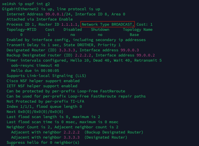 Here XE3 is elected as the DR because it has the highest router-id number, followed by XE2 as the BDR, while XE1 remains in DROTHER status.