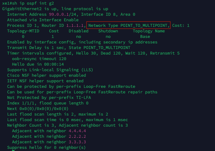 Checking the neighbor status, we see all the routers have been discovered, but what different from broadcast is there’s no DR/BDR election