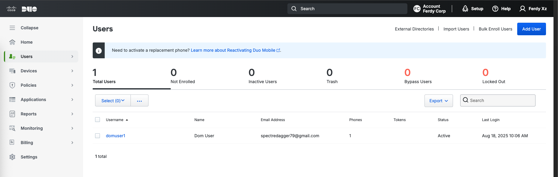To enable Duo, we’ll pretty much follow a similar implementation as this one, first we make sure the user is present on Duo with same username as the one on AD