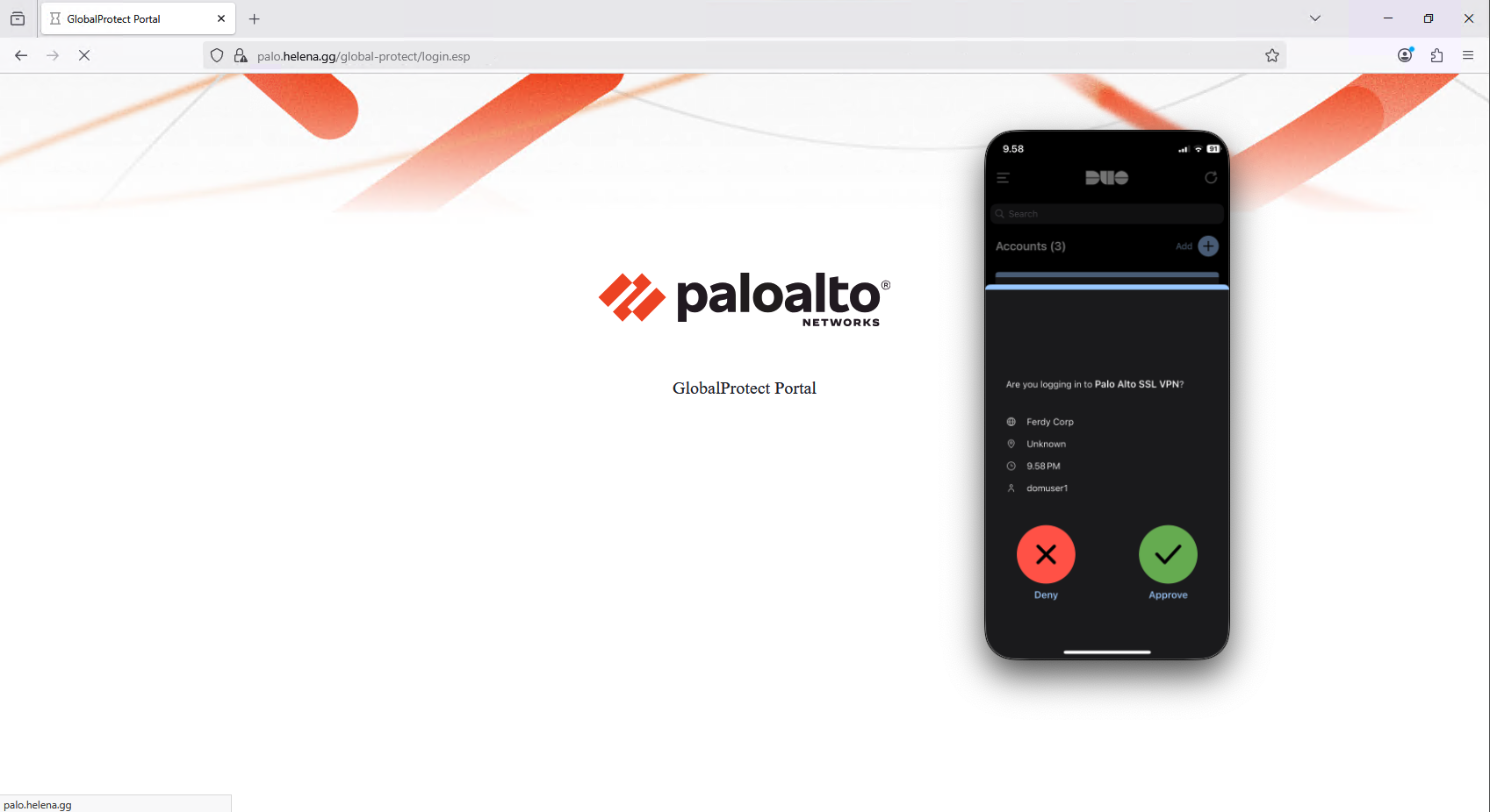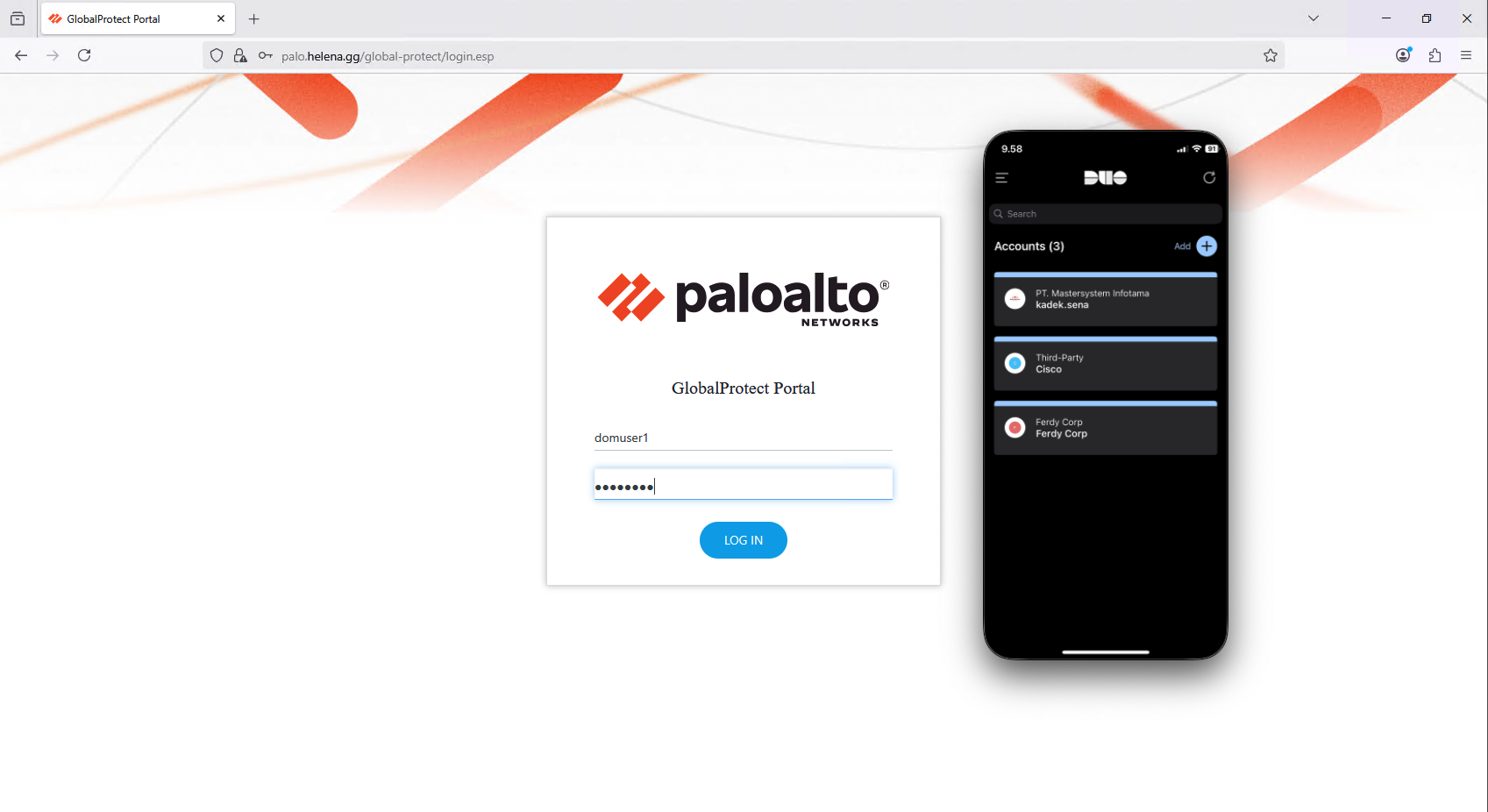 Palo Alto GlobalProtect VPN with Cisco Duo MFA adds a second layer of security to remote access. Users first authenticate with their corporate credentials through GlobalProtect, then Duo provides multi-factor authentication before granting VPN access, ensuring only verified users can connect securely.