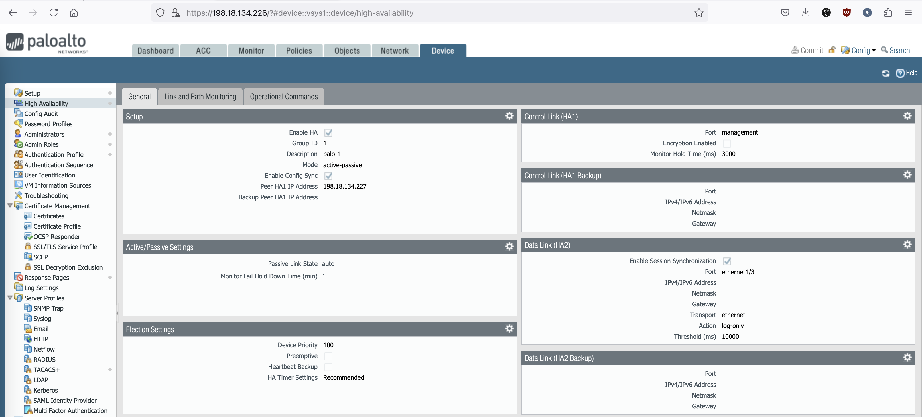 On the Palo-2, we configure pretty much the mirrored configuration with slight differnces in IP Addressing and Device Priority