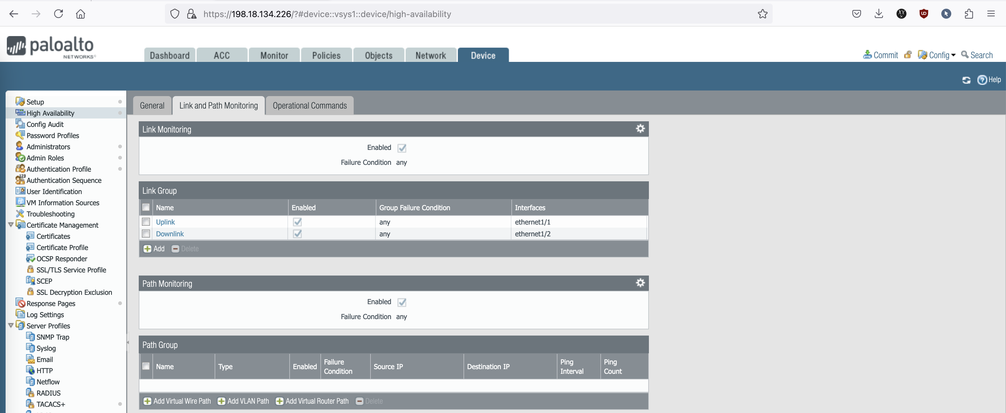 Next on Link and Path Monitoring, here we speicify the links that we’d like to monitor to trigger the failover