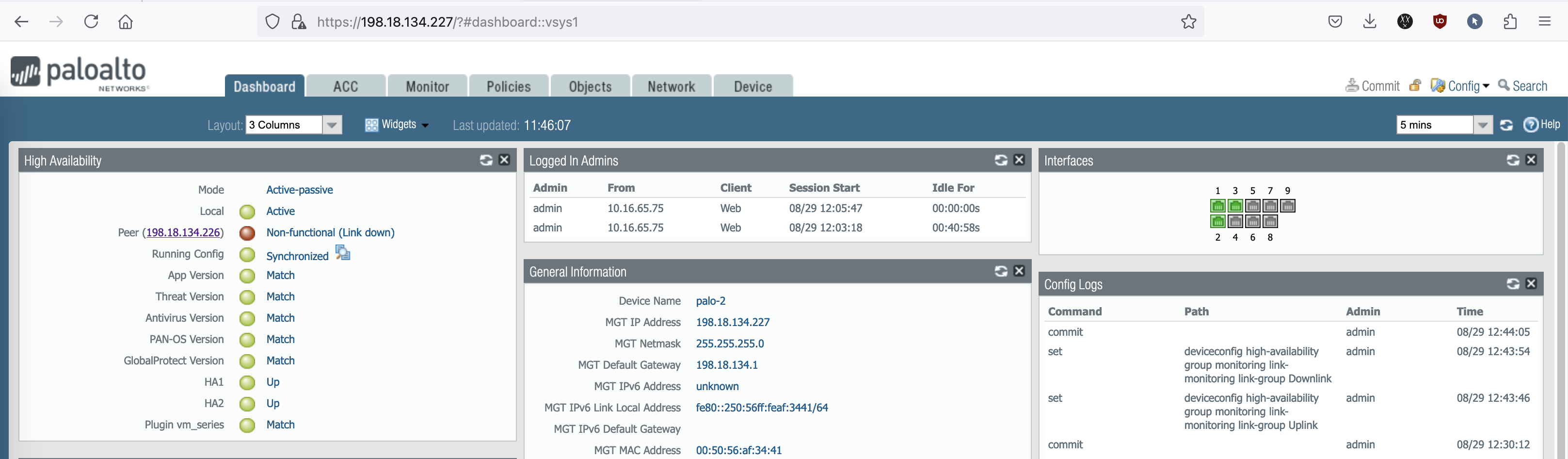 If we restore network functionality on Palo-1, it will just sit in Passive Node until there’s failure happening on Palo-2