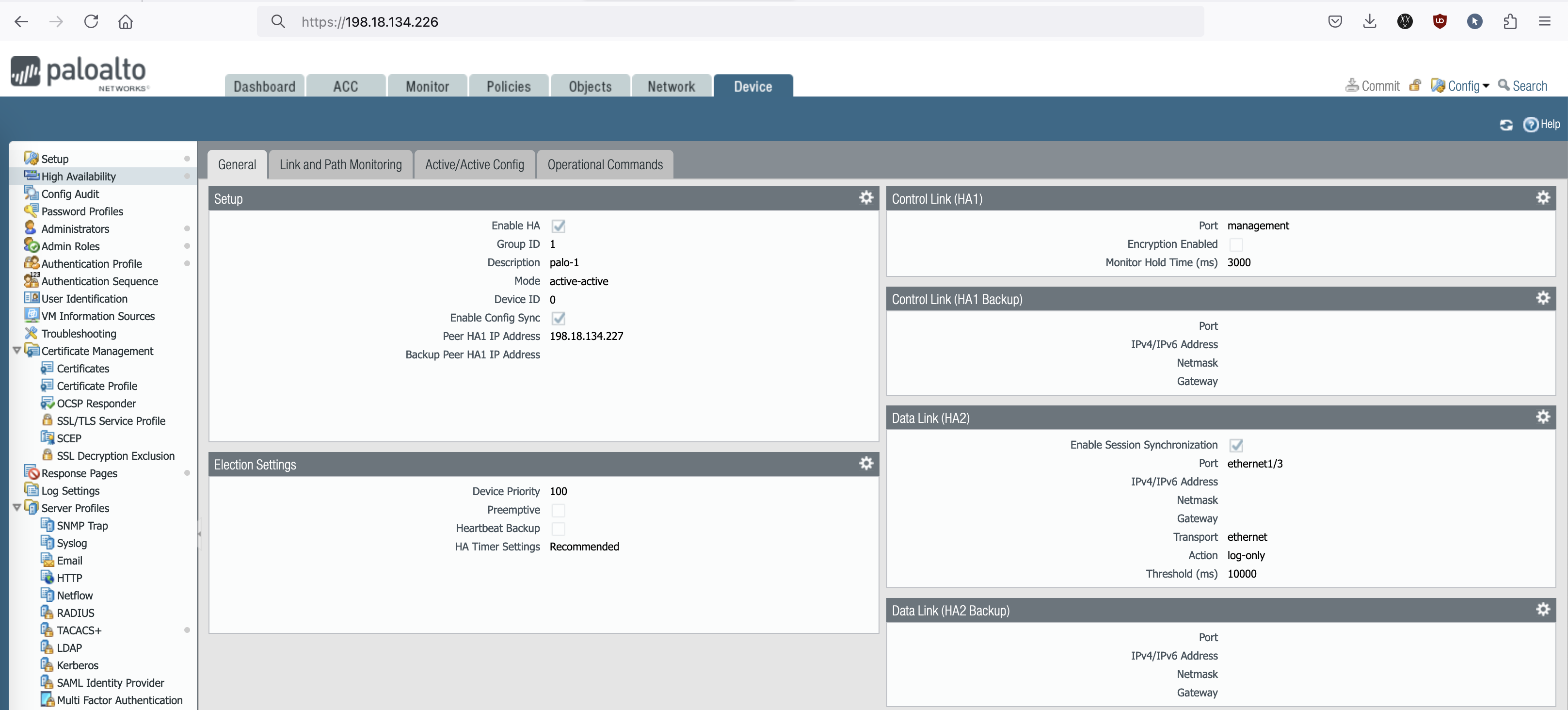 On Palo-1, we configure the HA cluster with the mode of Active-Active, other than that the rest of configurations is pretty much the same as previously