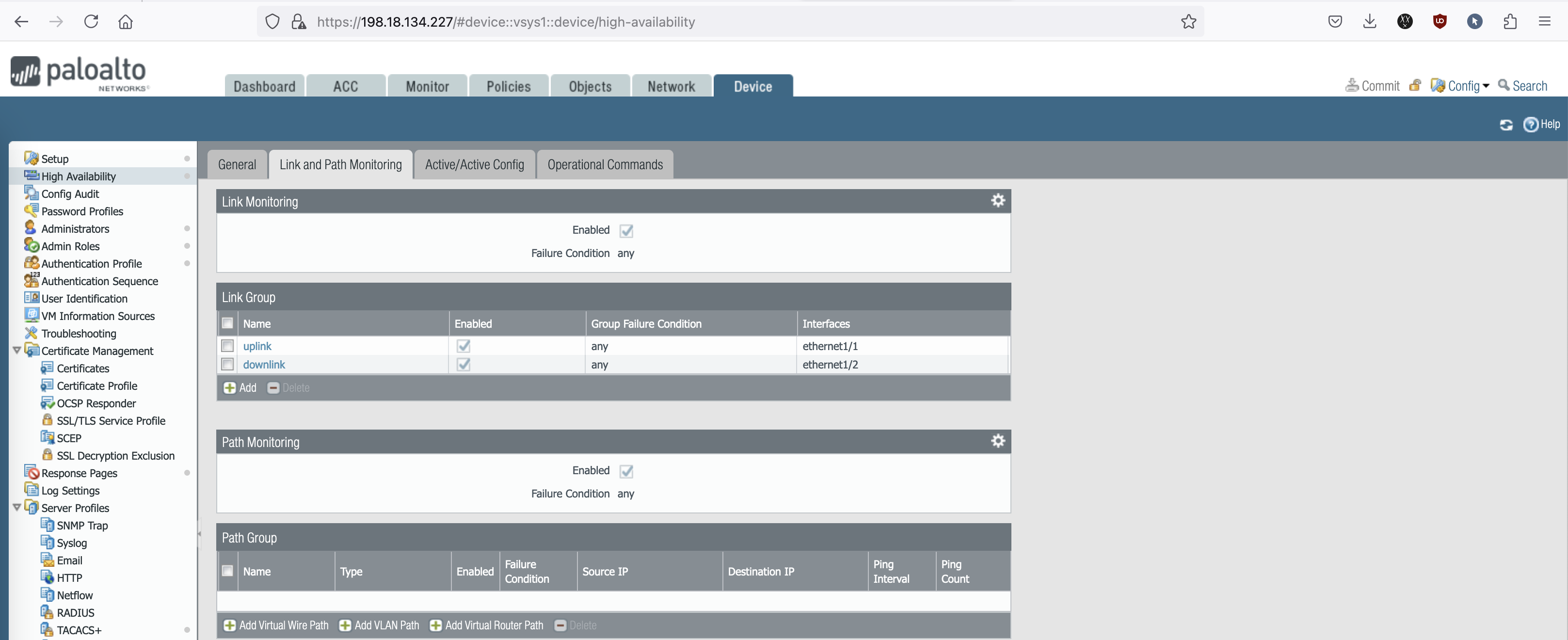 Now if there’s a failure on the uplink or downlink interface on Palo-1, the cluster will failover to make the Palo-2 the Active Node