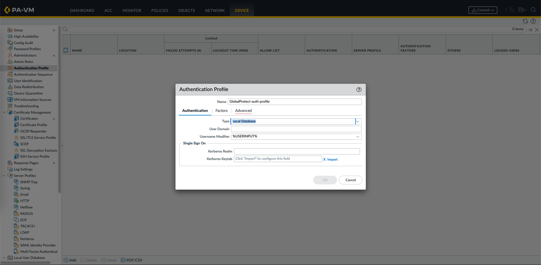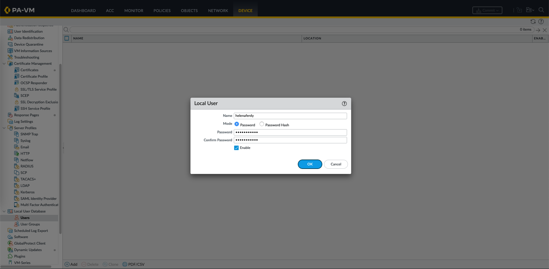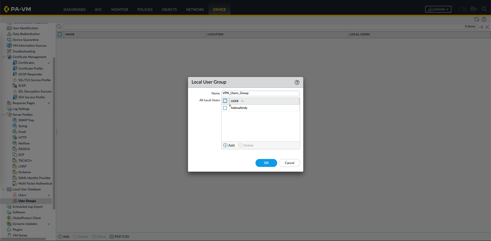 For VPN Users, here we’ll use locally stored users, On Device » Local User Database, add new