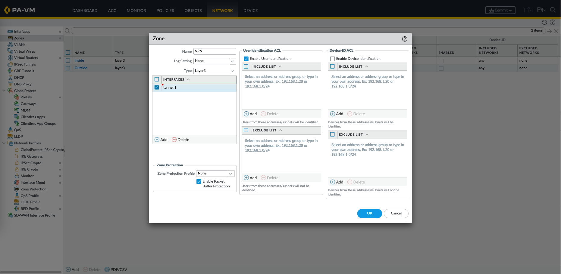 On Network » Zones, add new VPN Zone, attach it to Tunnel Interface and enable User ID ACL