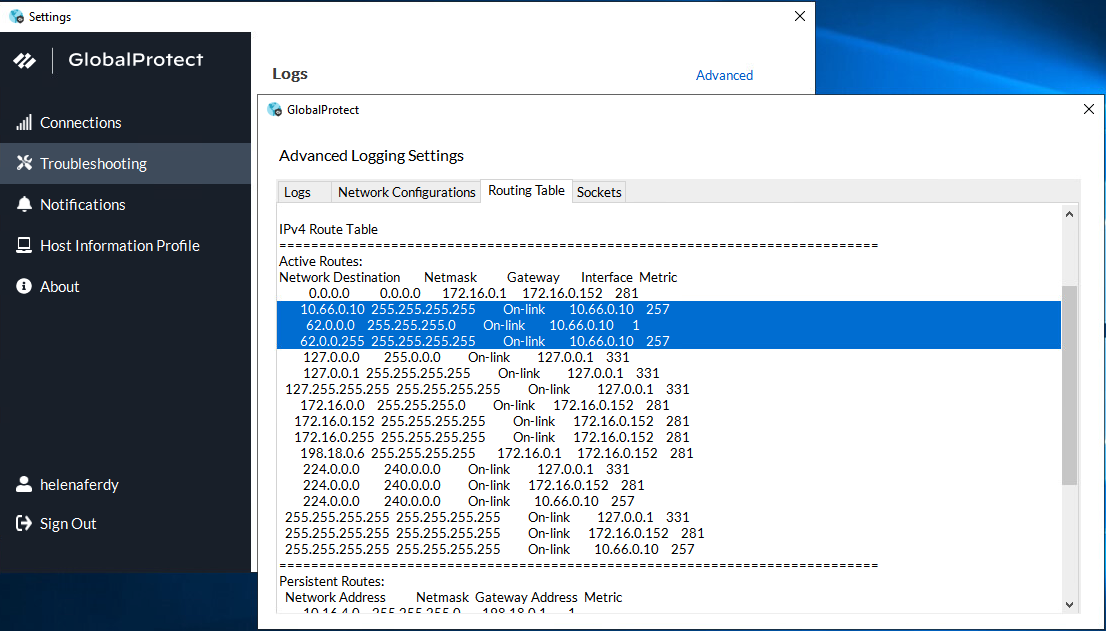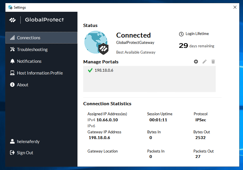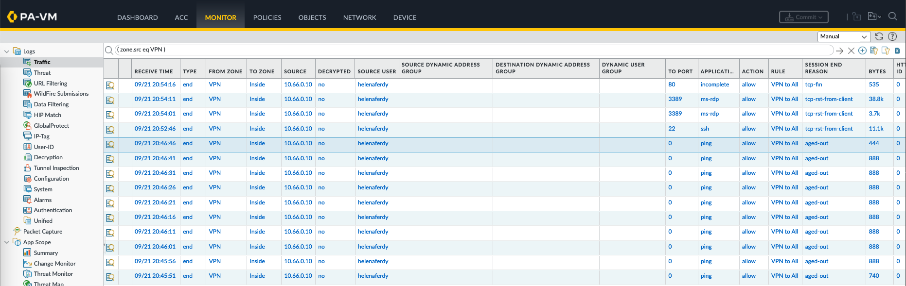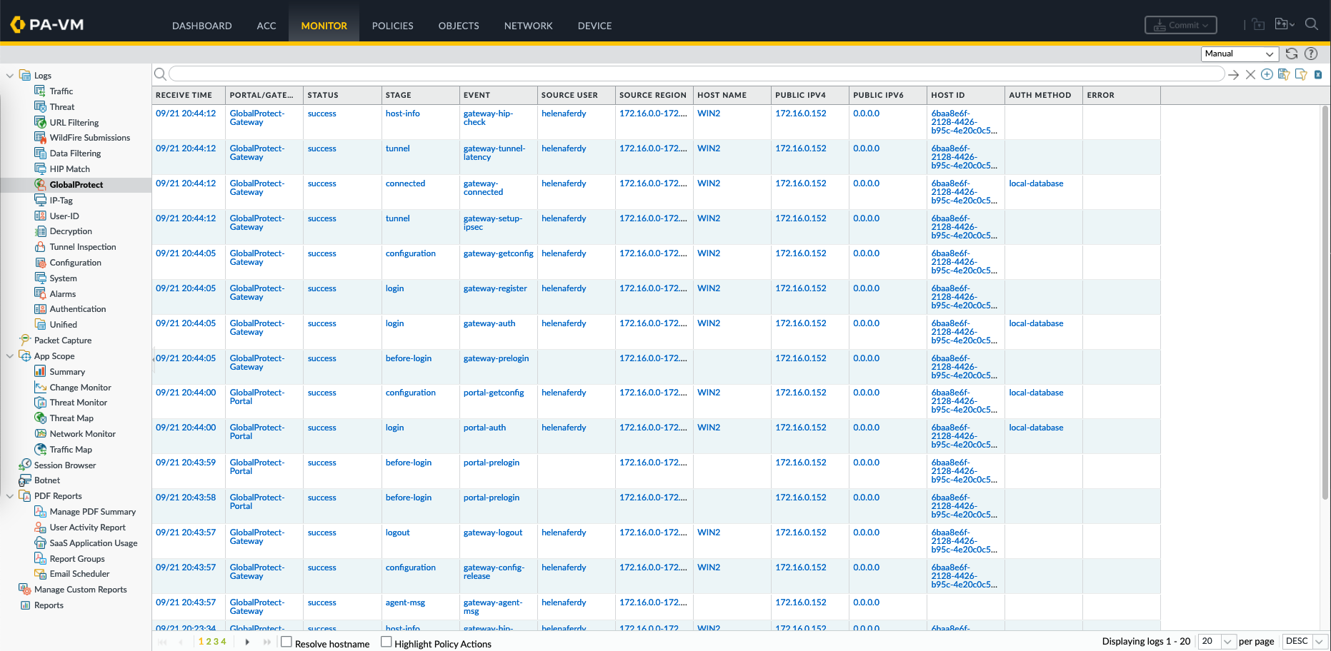 Back to Palo Alto, on Monitor » Global Protect, we can see the VPN activities