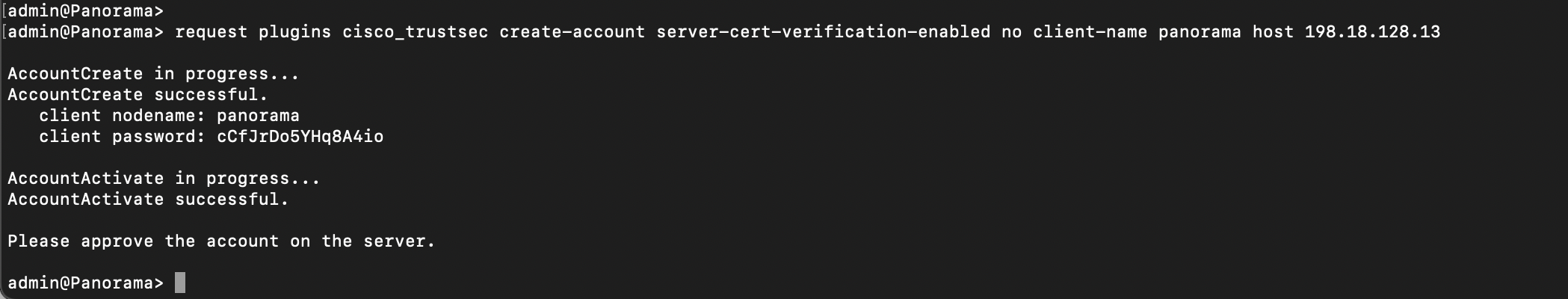request plugins cisco_trustsec create-account server-cert-verification-enabled no client-name panorama host 198.18.128.13