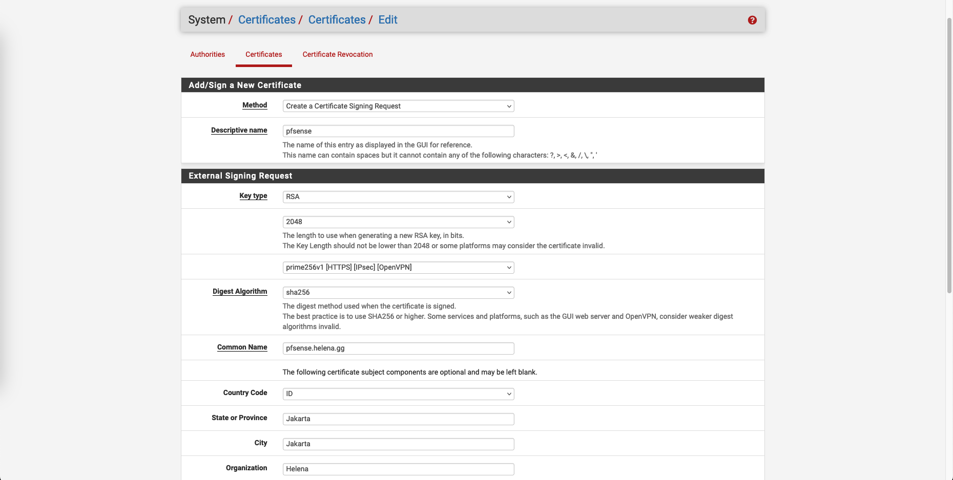Next create a CSR for our pfSense’s certificate