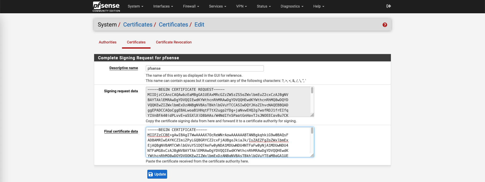 Here we already have a CA server, so lets just add it as our Trusted CA on pfSense on System » Certificate » Authorities