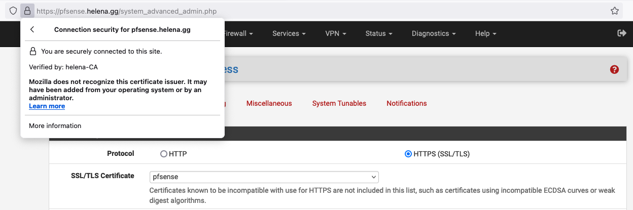 Bonus and completely optional, use that certificate on our web server on System » Advanced » Admin Access so we get a trusted secure HTTPS connection