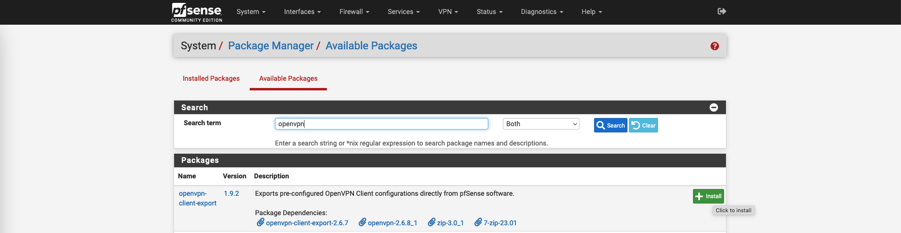 Before configuring OpenVPN, lets install a package to ease the process of exporting OpenVPN Client Configuration later