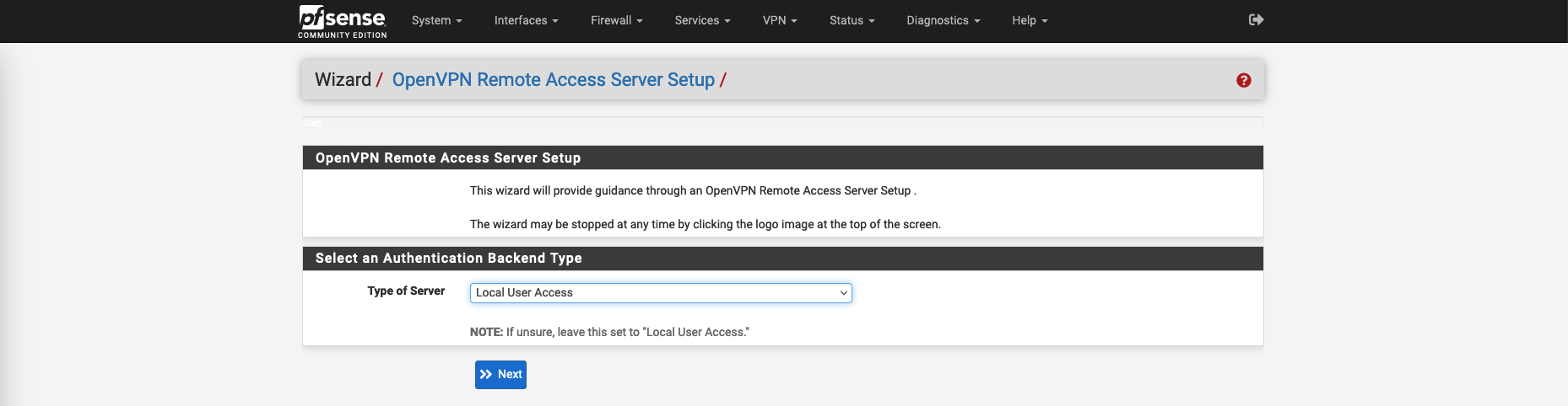 To configure OpenVPN, go to VPN » OpenVPN » Wizard, select the type of Local User Access