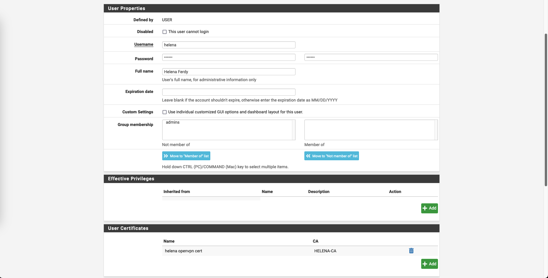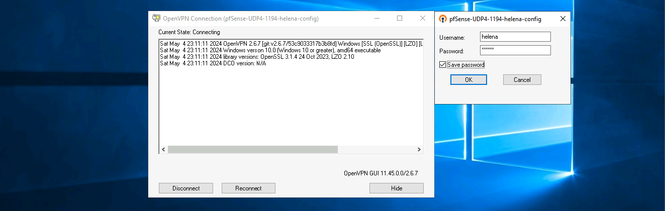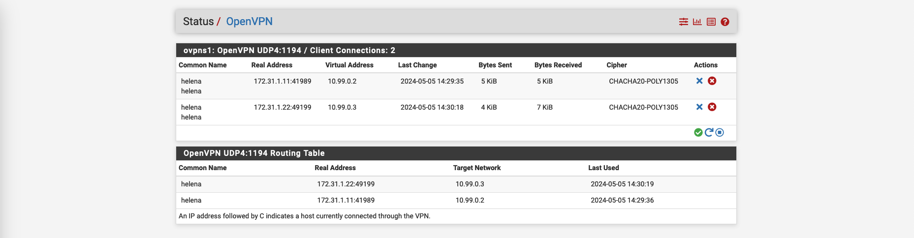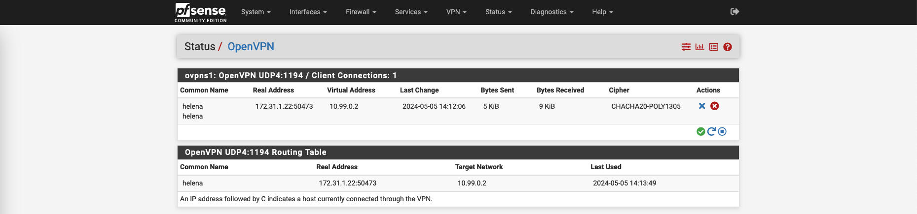 Back on pfSense, on Status » OpenVPN, we can see the user helena is connected