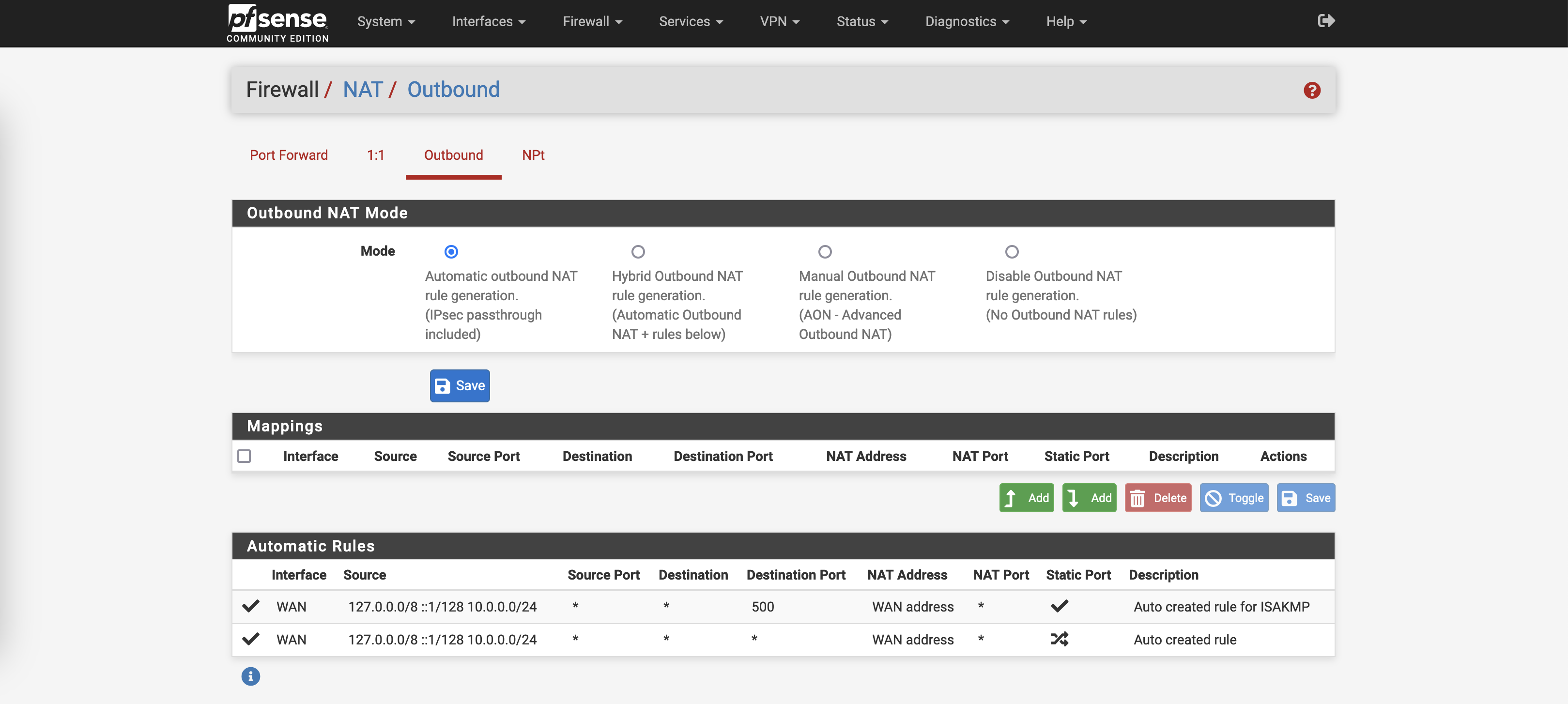 First, on Firewall » NAT » Outbound, create a NAT rule for our LAN network