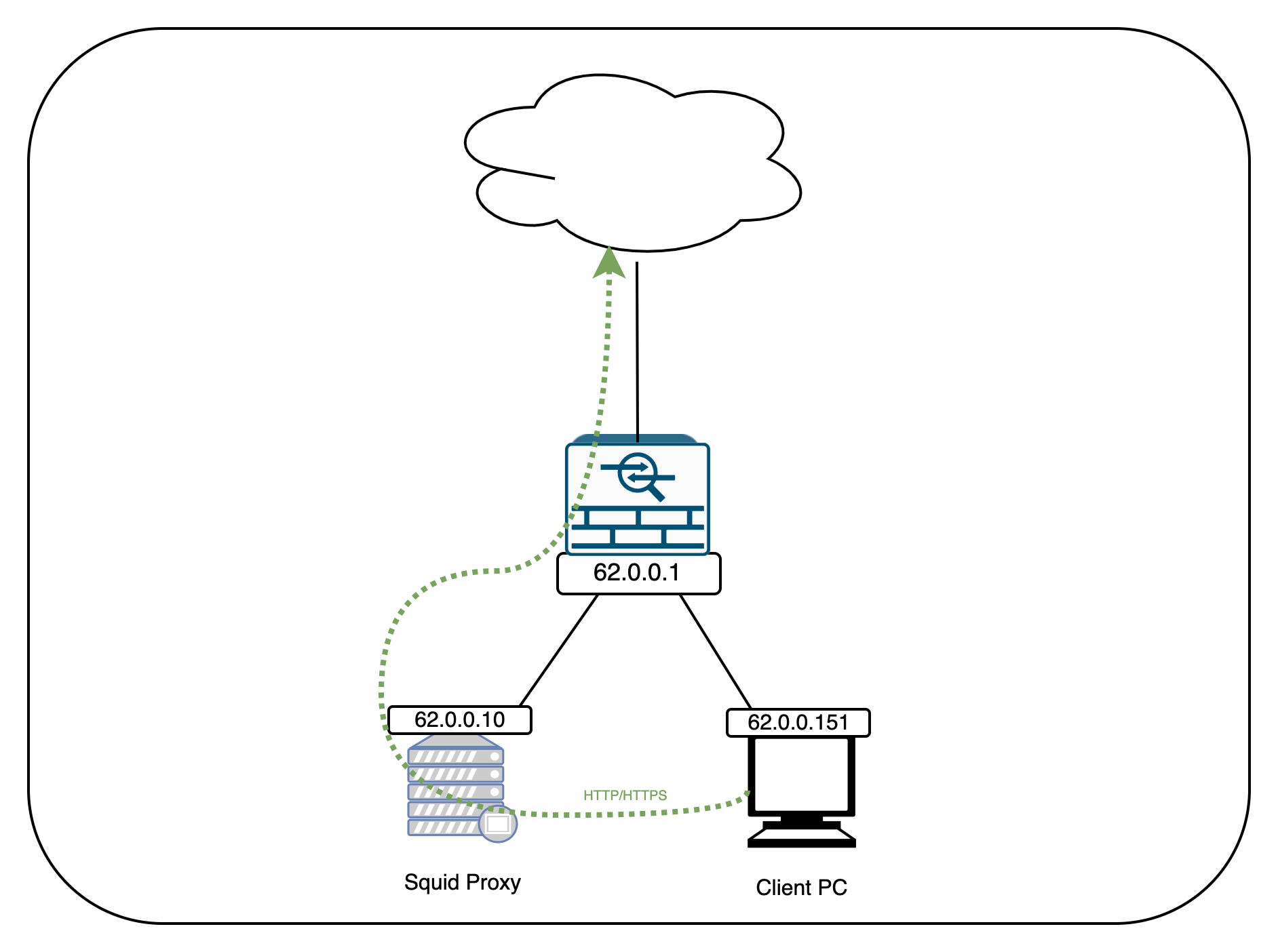 Here’s the connection topology, where all the HTTP/HTTPS traffic from client will go through the proxy server first before going to the firewall then the internet