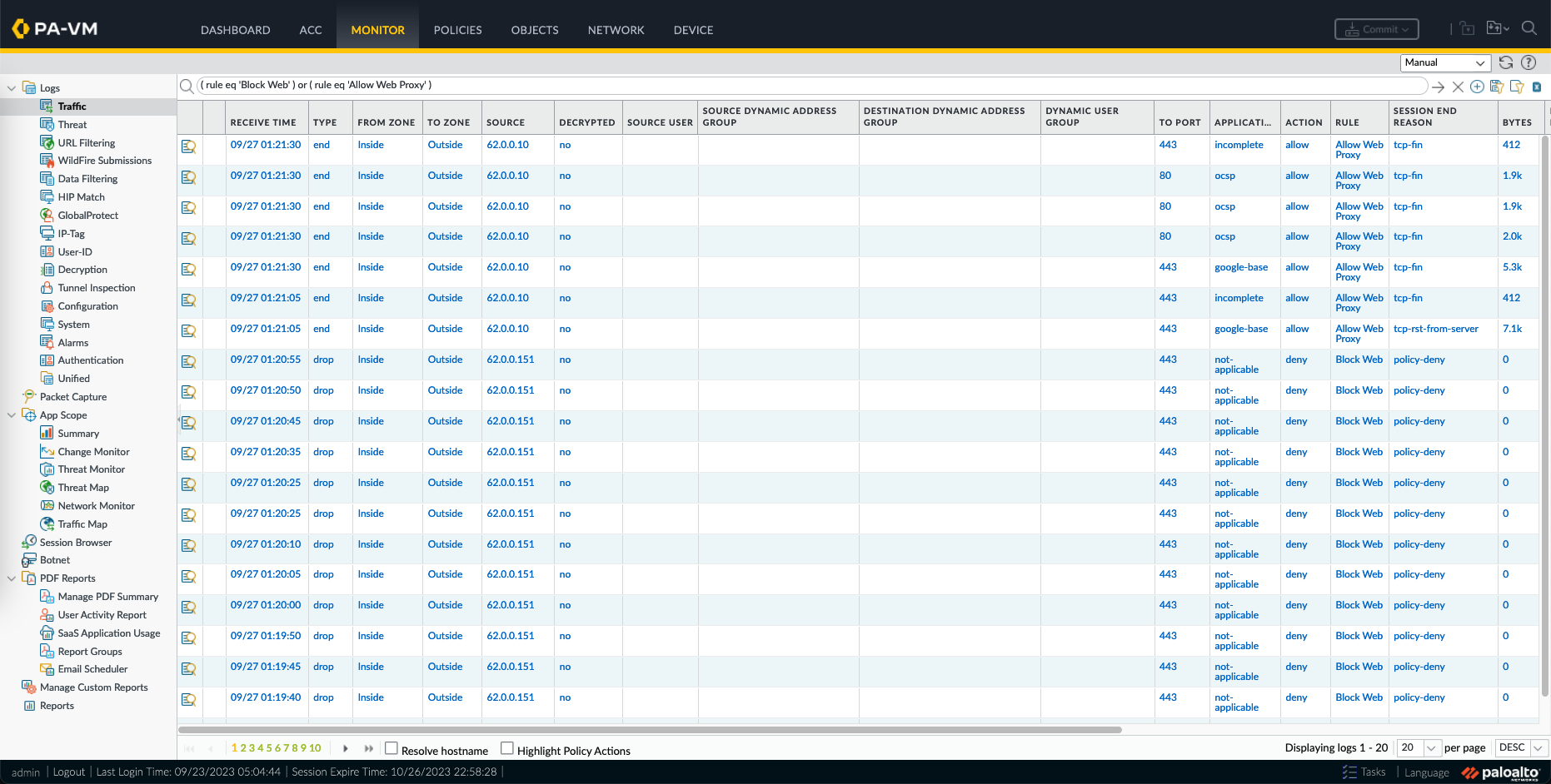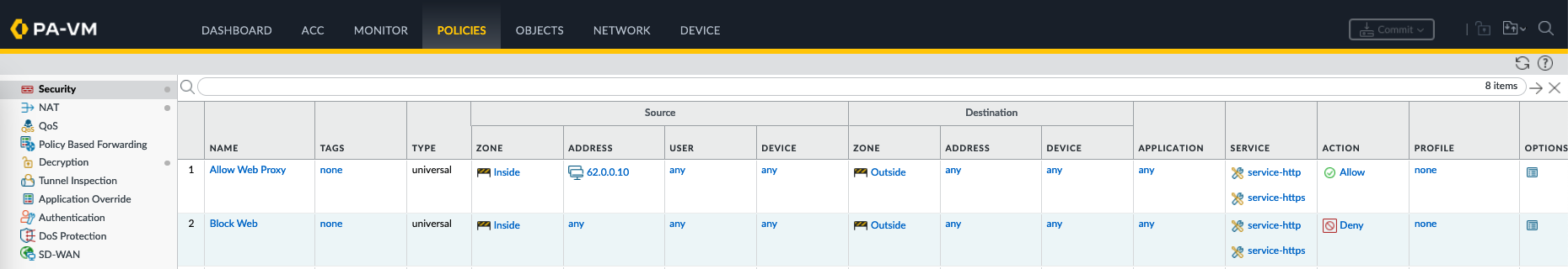 Checking the traffic logs on the firewall, we should see only traffic from the proxy server is allowed