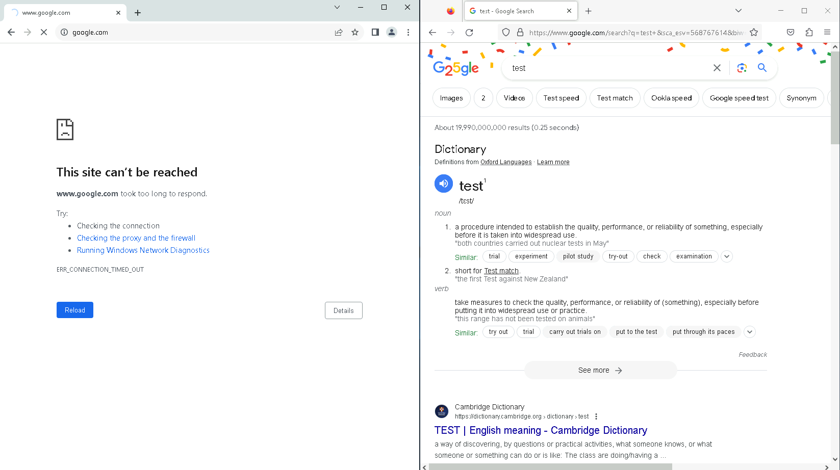 chrome (left) doesnt have proxy configured, while firefox (right) does