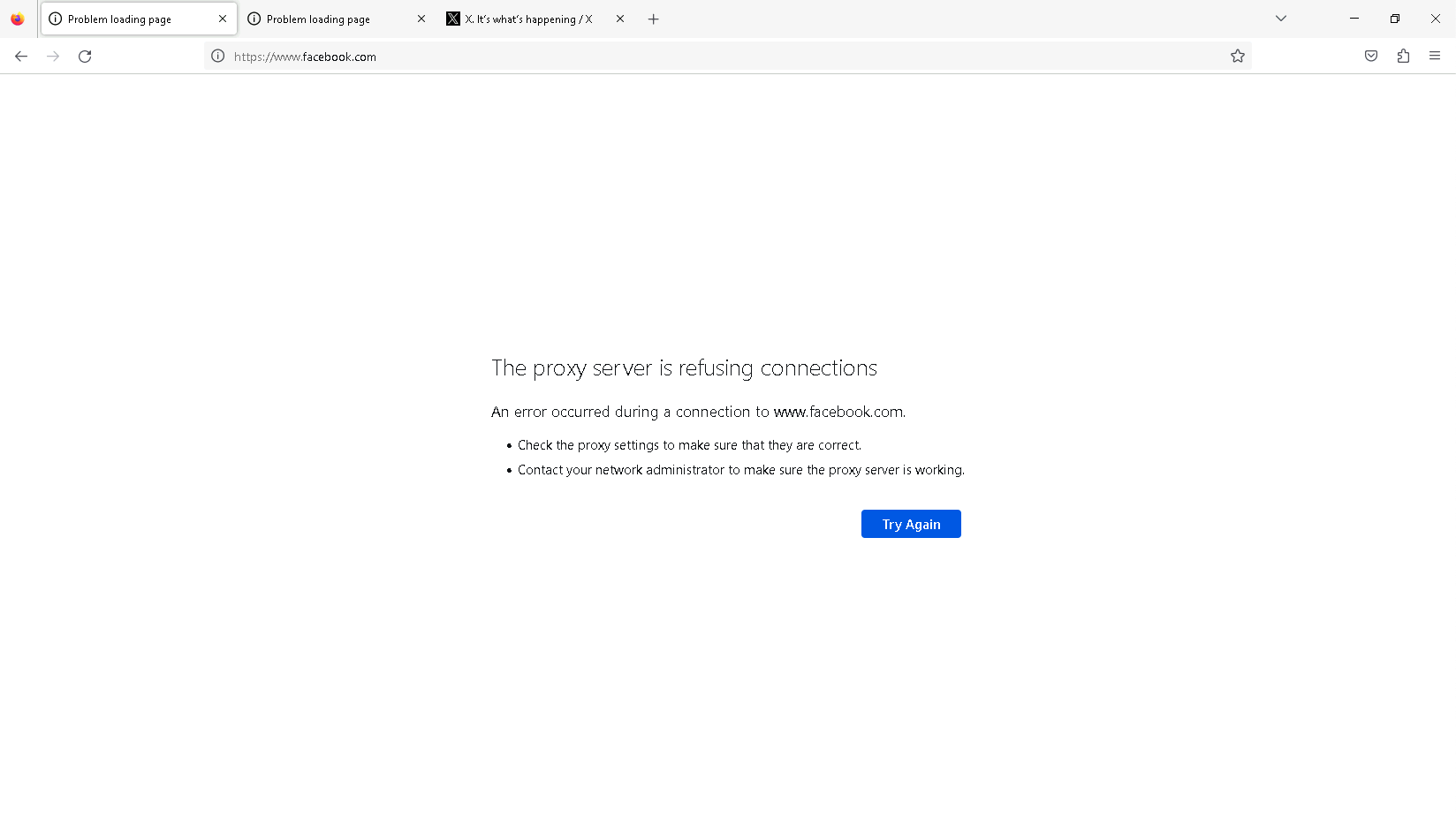 Now if we access facebook or reddit, we should see error saying proxy refuses the connection