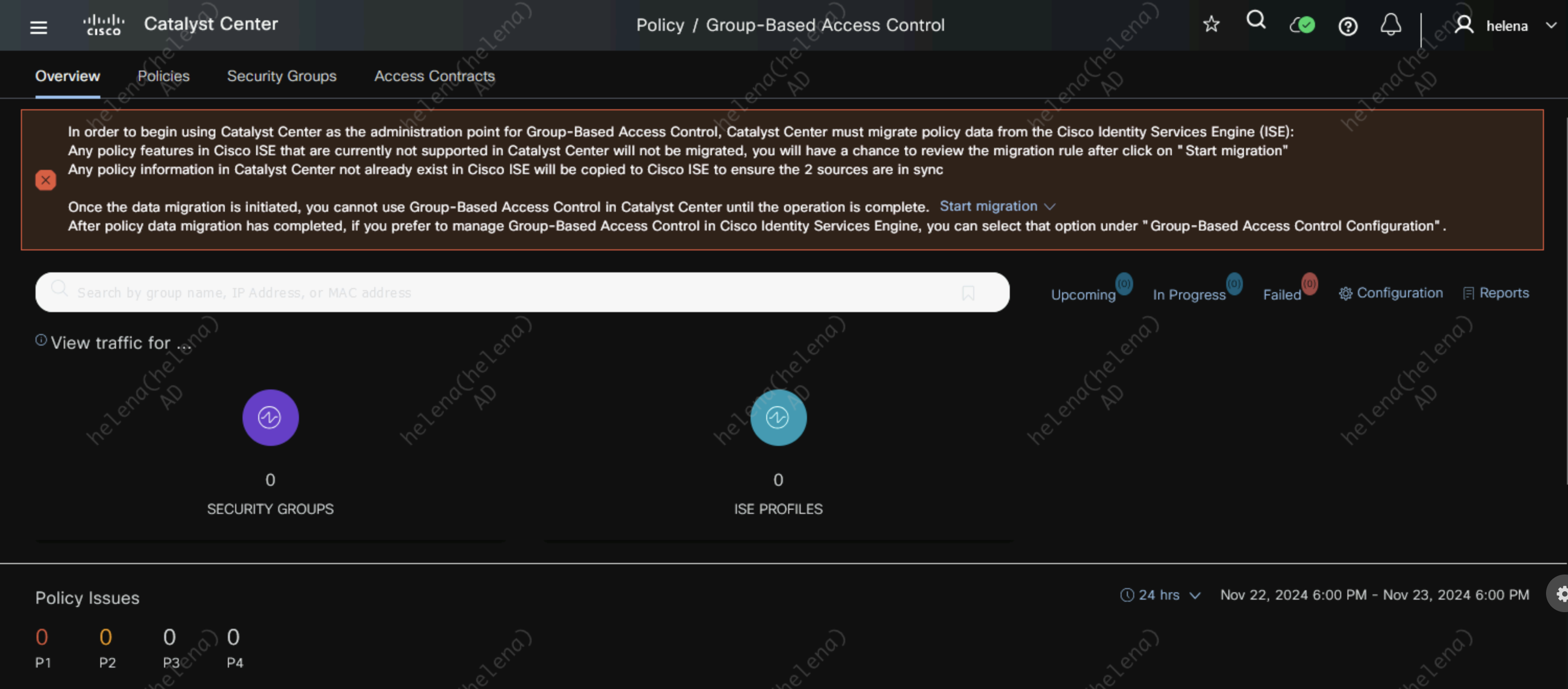 Next we’ll import TrustSec settings from ISE, on DNAC » Policy » Group-Based Access Control, hit start migration