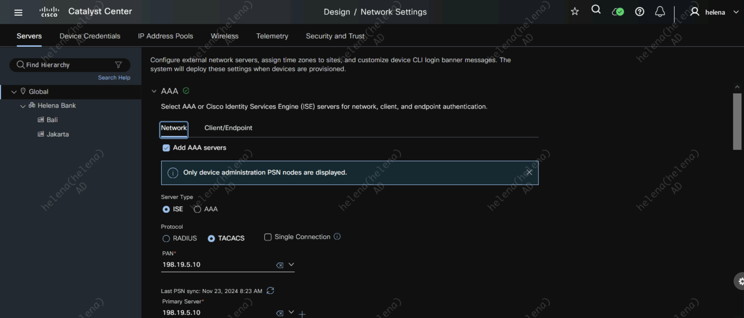 Then on Global Site, configure the ISE as the AAA Server. For network device we select TACACS