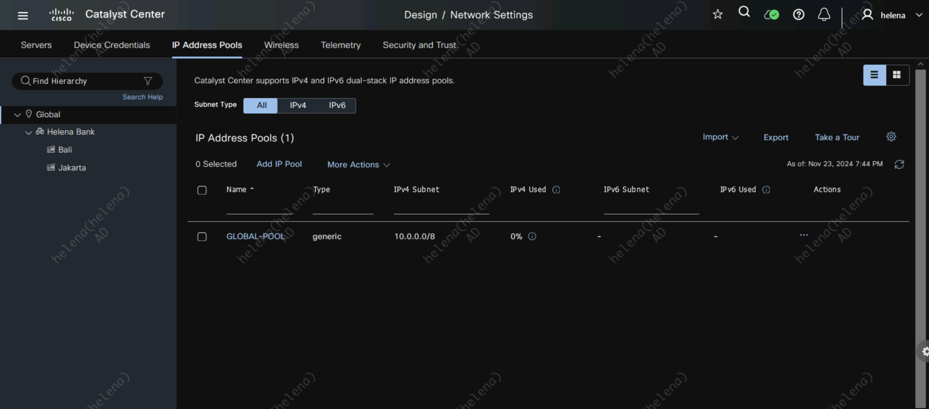 Next on IP Address Pools, we create a 10.0.0.0/8 global pool that we will later reserve for each site