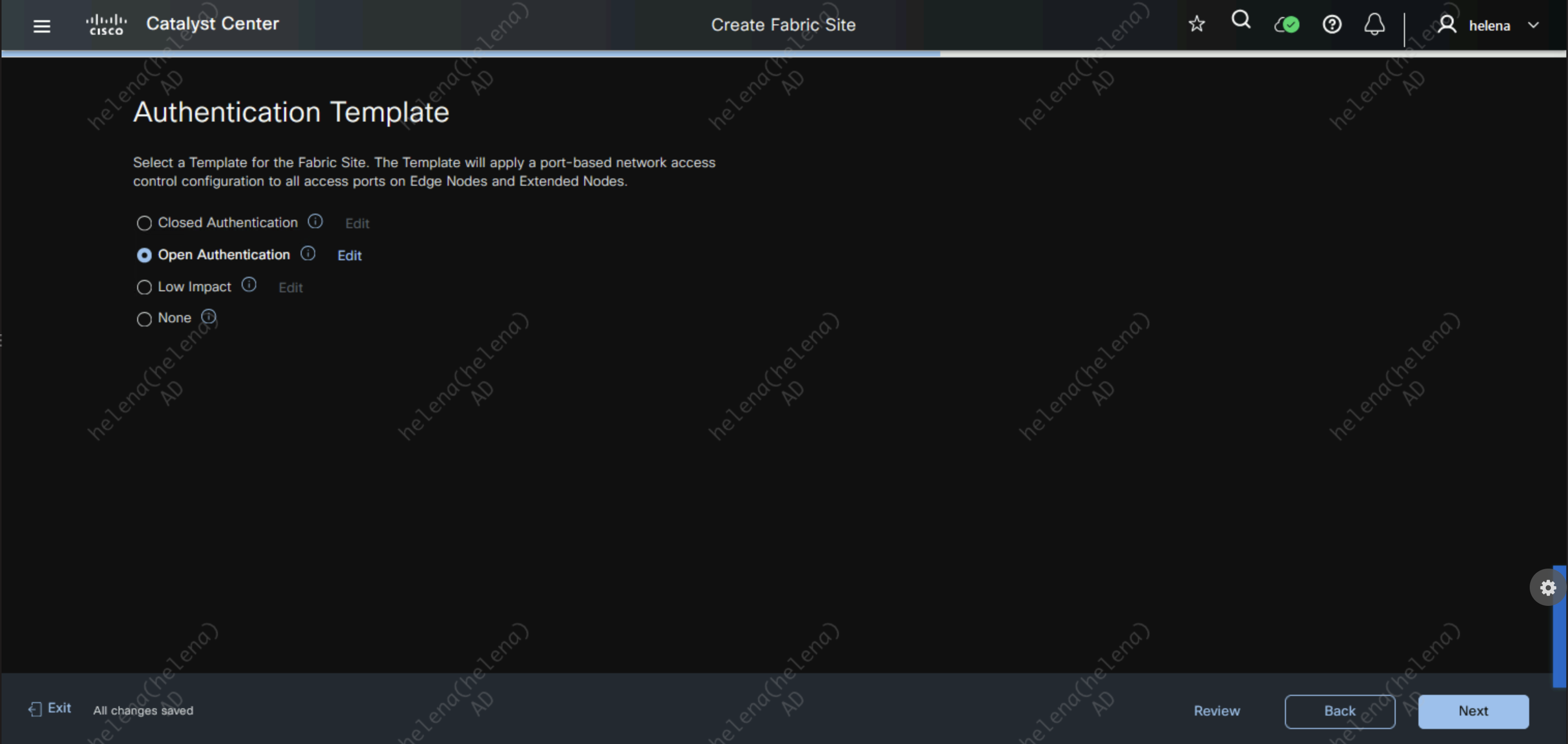 Select the Open Authentication so all edge ports are set to authenticate using Dot1x but still being able to get limited network access before like DHCP and DNS