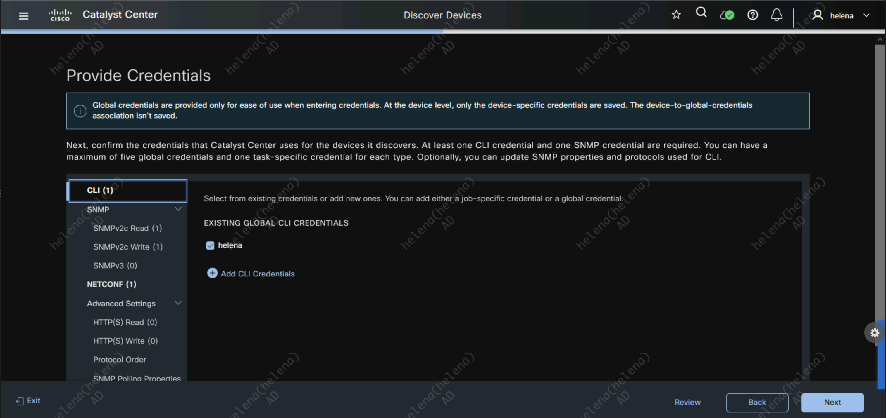 Next on Device Credentials, we configure the default CLI and SNMP credentials to access our NAD