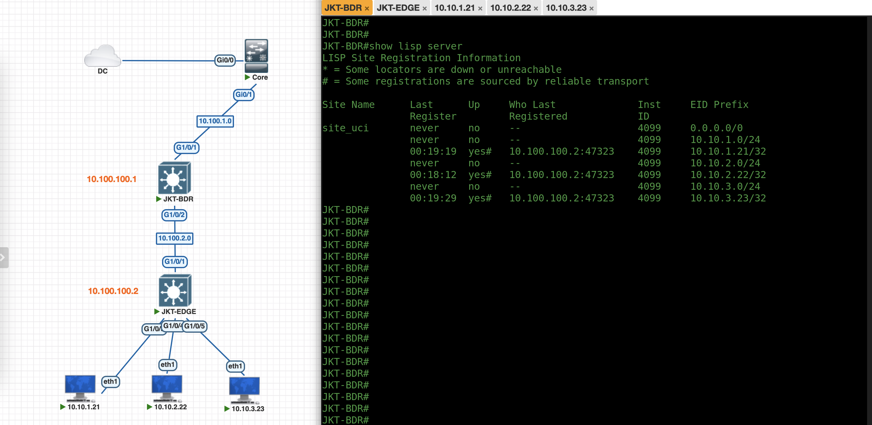 On JKT-BDR running “show lisp server” shows that the Locator/ID Separation Protocol (LISP) configuration is running and it displays the registration status of End-Point Identifiers (EIDs) to the Map-Server/Map-Resolver (MS/MR) within the fabric.