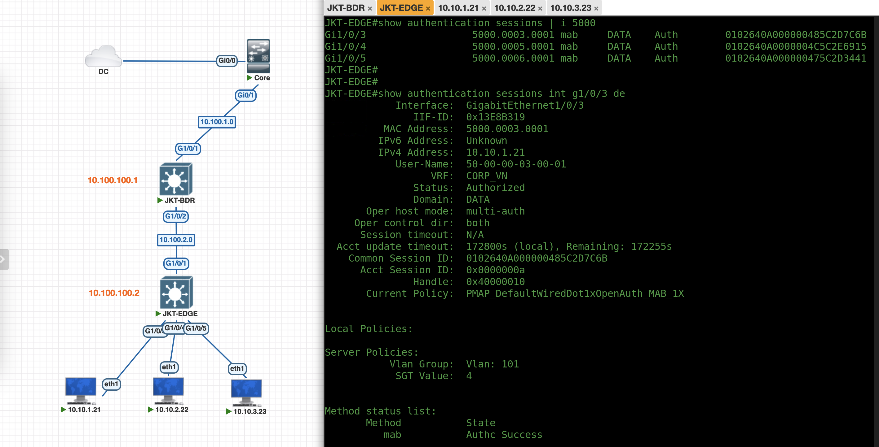 “show auth sessions” shows that each port is now authenticated against ISE for network access