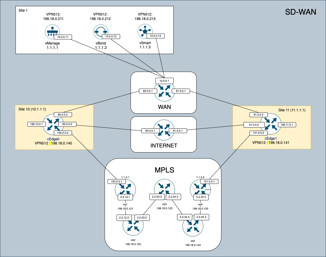 This is the overall topology for this SD-WAN Deployment, where there will be vManage, vBond and vSmart as the central controllers, and there will be 2 Edge Routers with 3 WAN Networks.