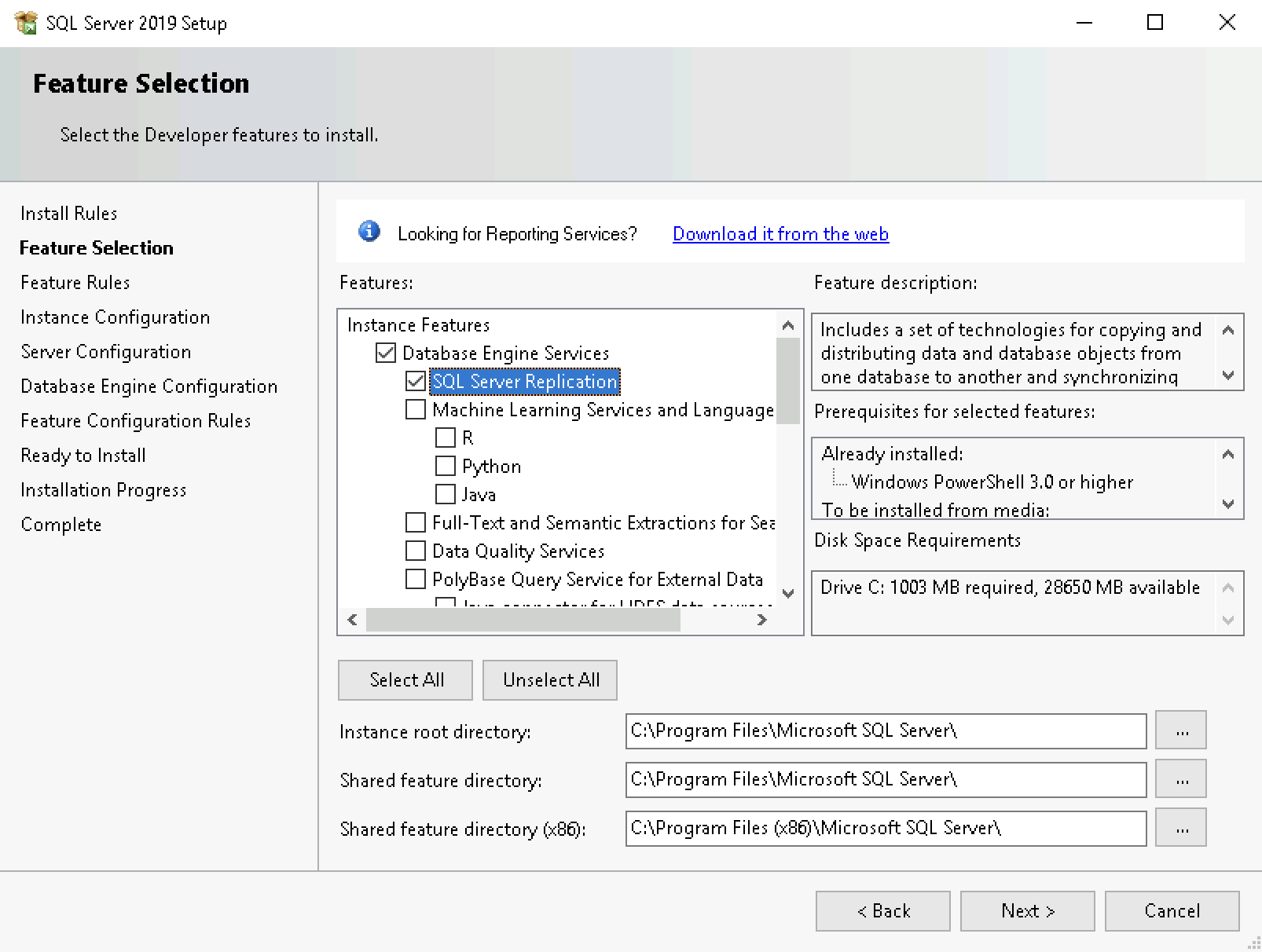 When installing SQL Server, make sure to also install the SQL Server Replication Feature