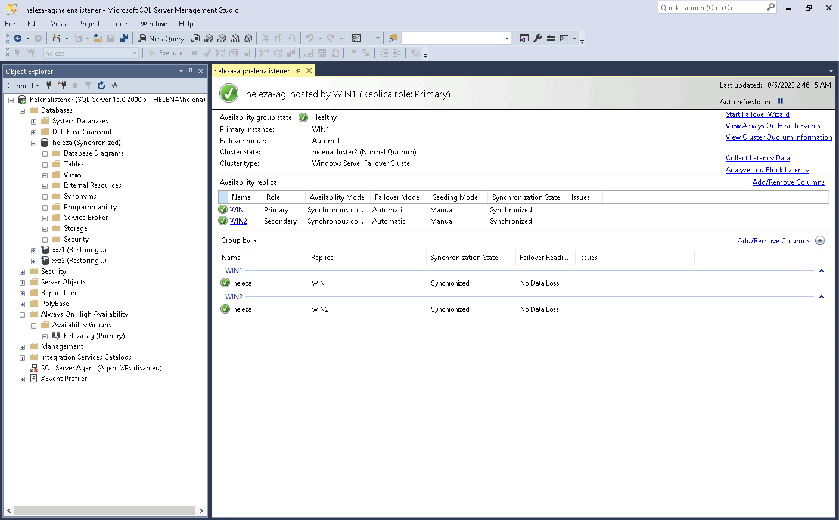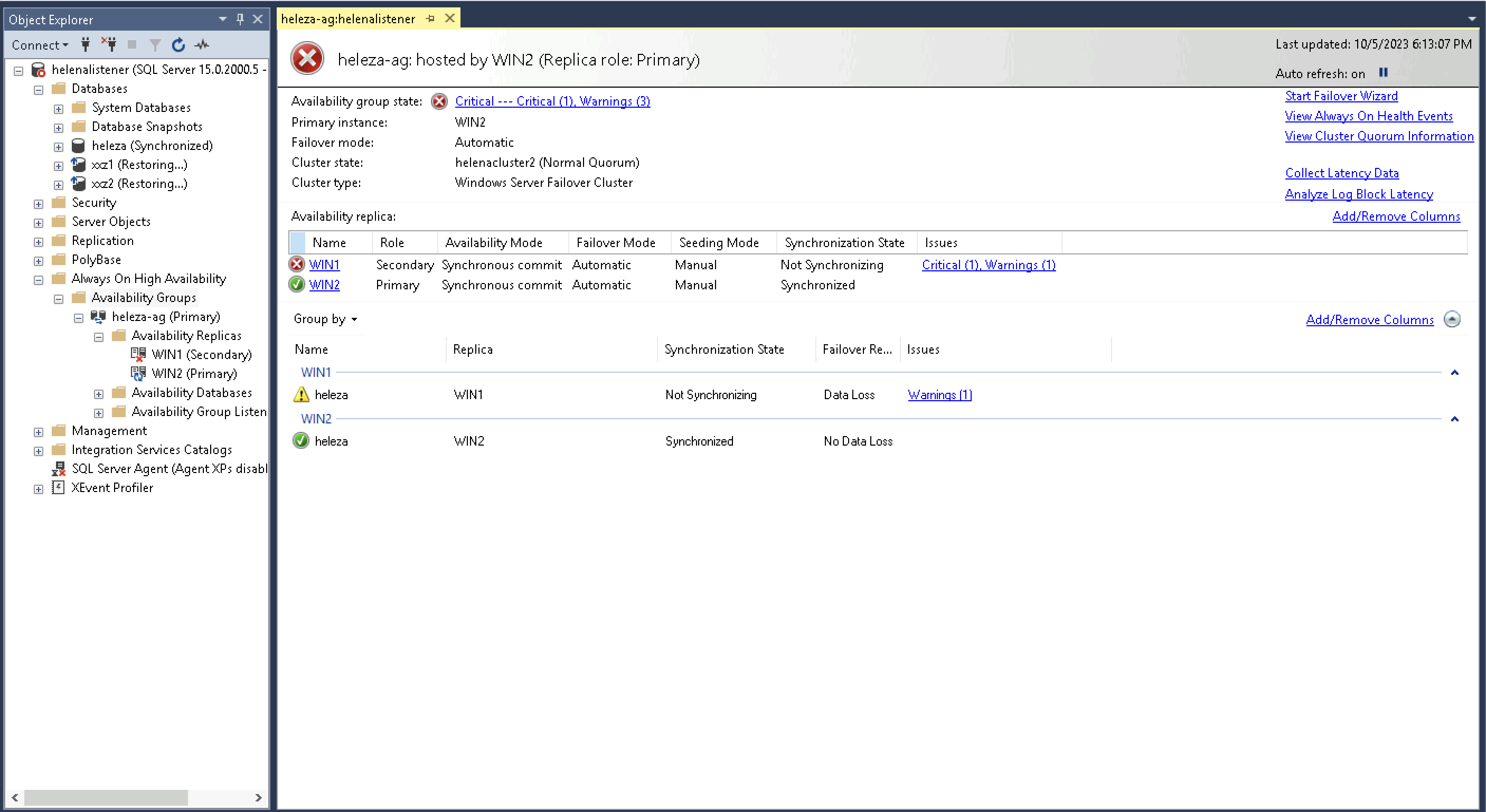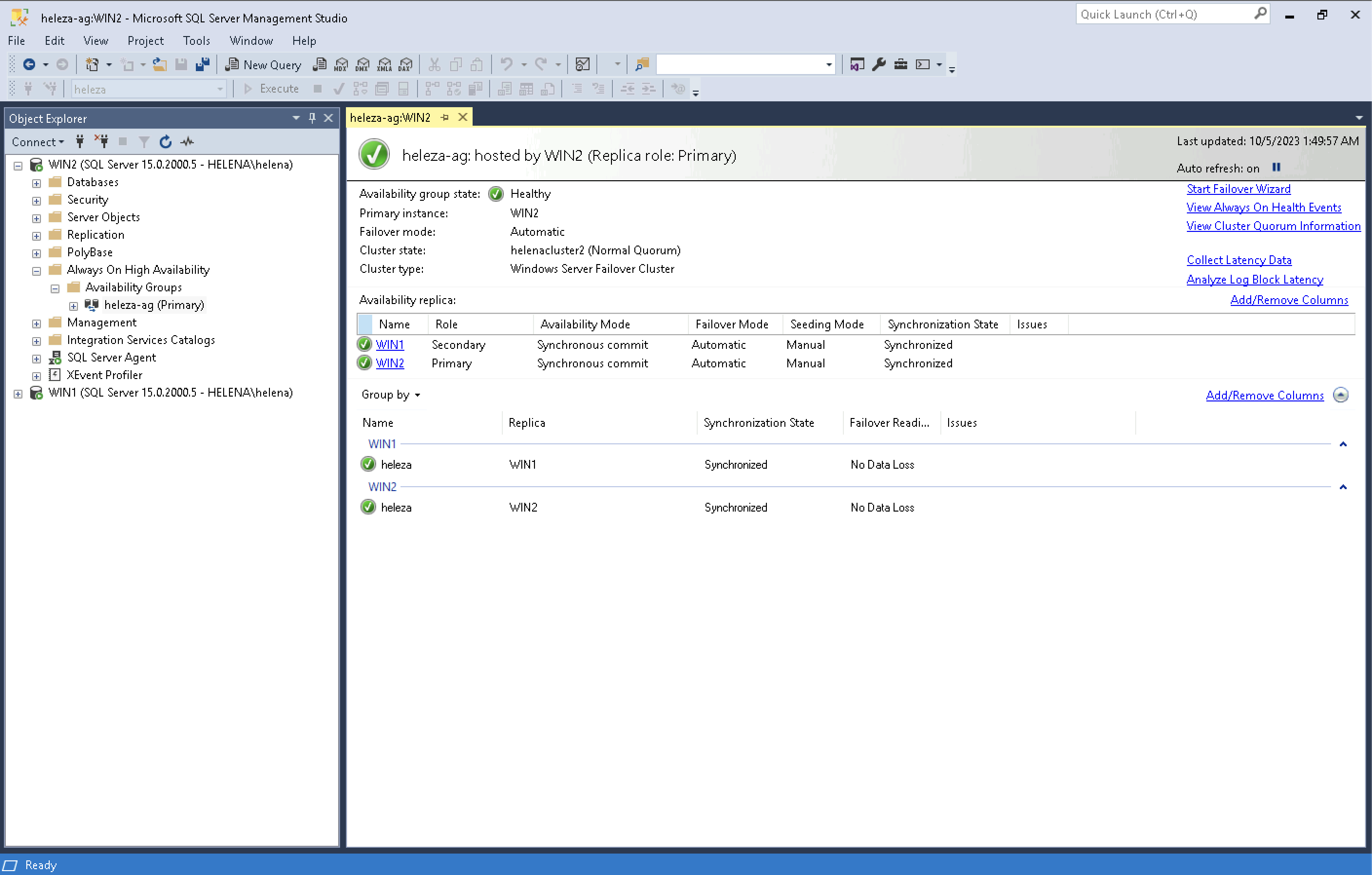 Opening the Always On Dashboard also shows the primary replica is now on Win2