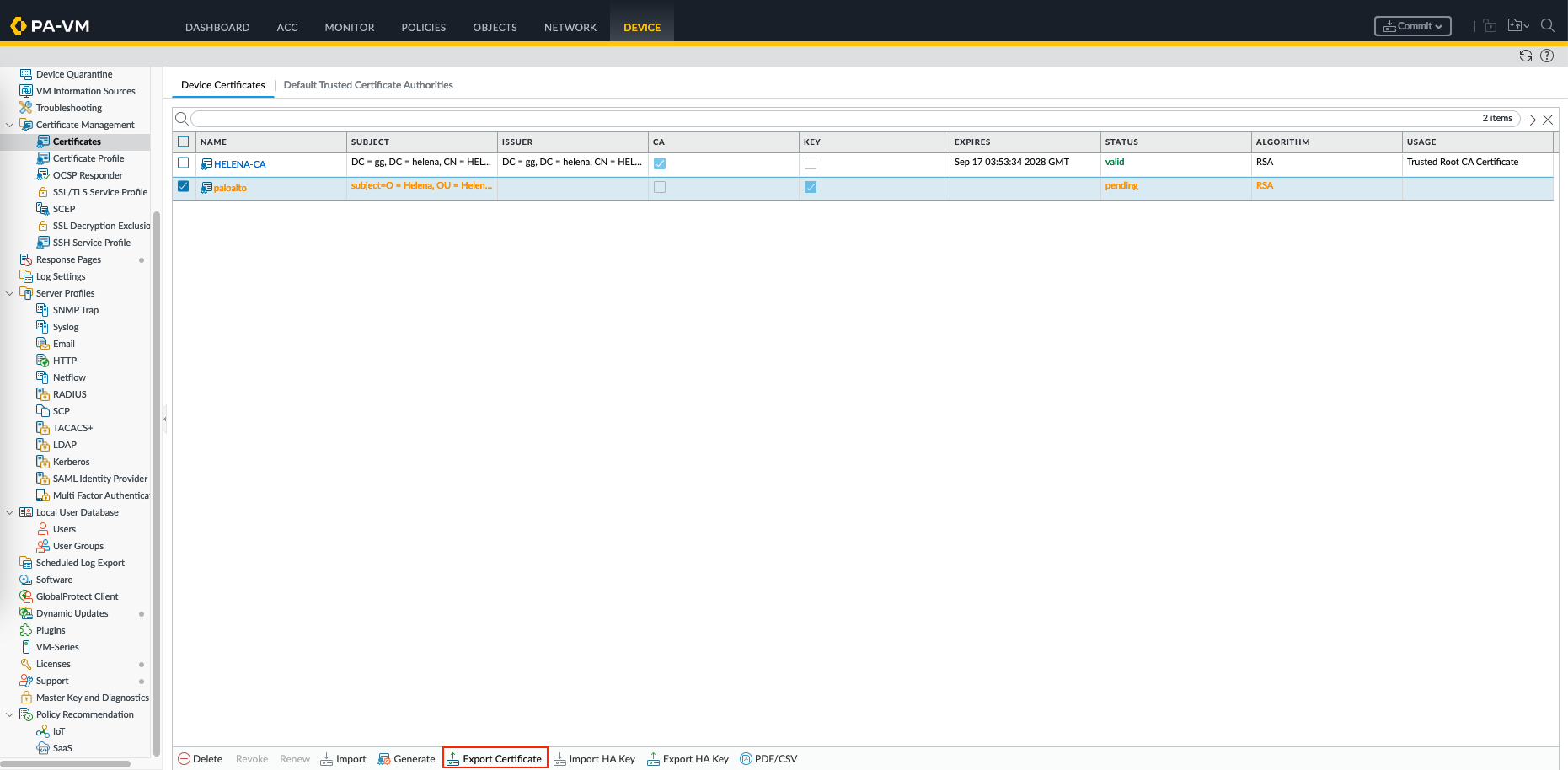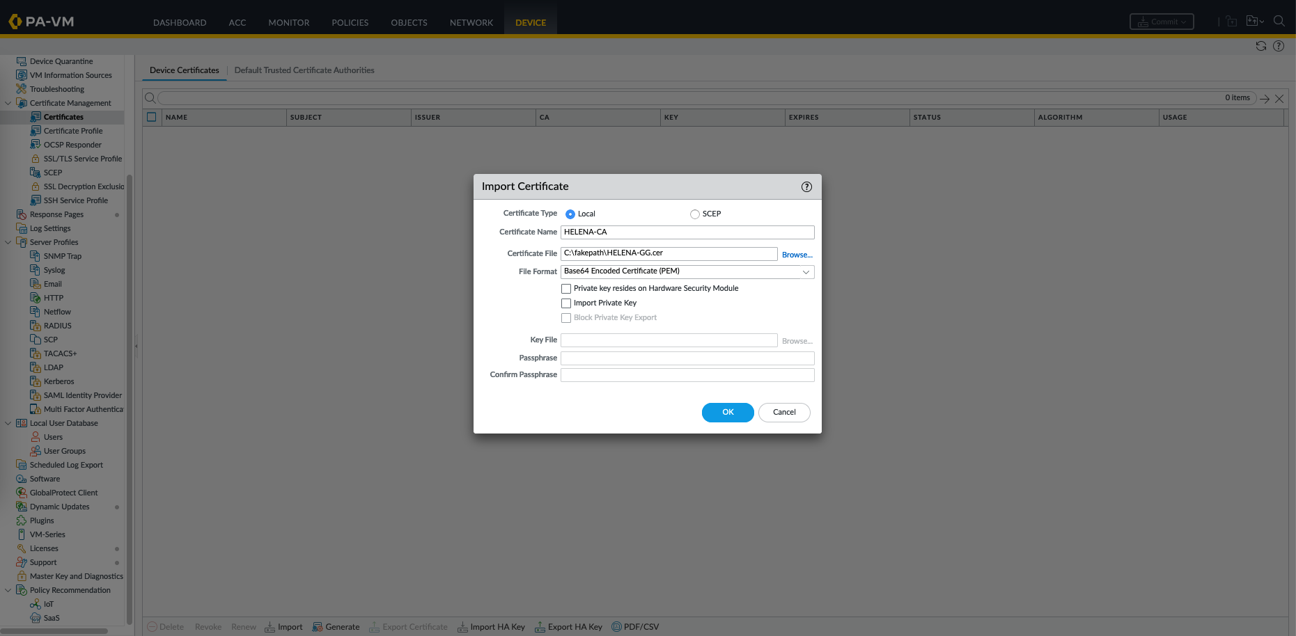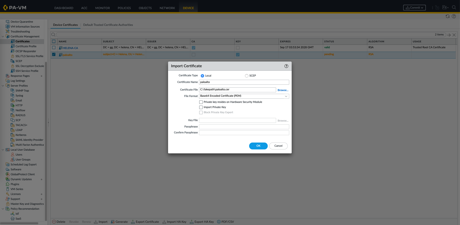 Then on Palo Alto, go to Device » Certificates » Import