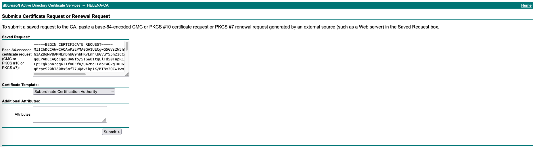 Next Sign the CSR on the CA Server, use “Subordinate Certificate Authority” template